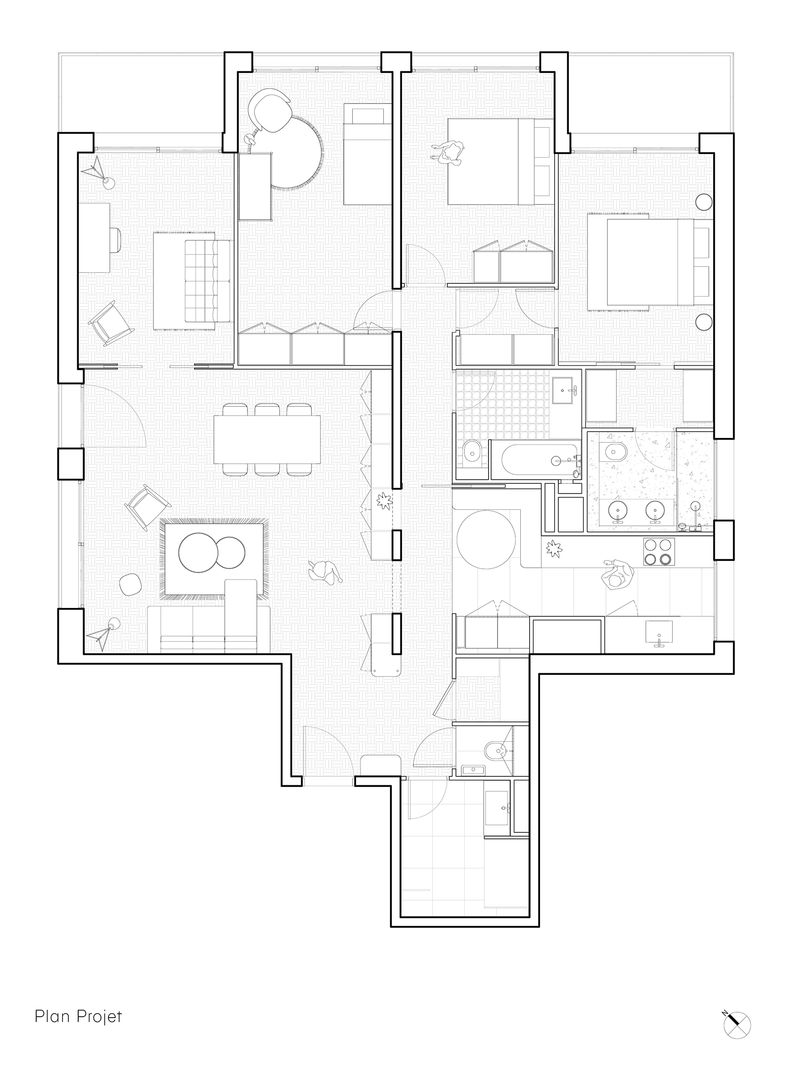 A quelques pas de la place de la Bastille, ce bel appartement des années 70 a été entièrement rénové. Le plan caractéristique de l’architecture des années 70 proposait déjà une distribution quasi optimale mais il était important d’offrir plus de fluidité aux circulations.