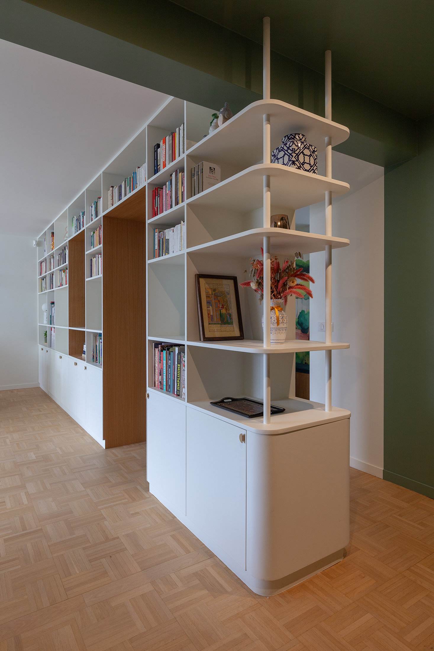 Ainsi la circulation entre séjour, cuisine et entrée est repensée autour d’un élément central, une bibliothèque s’articulant autour du mur porteur et formant une proue dans l’entrée.
