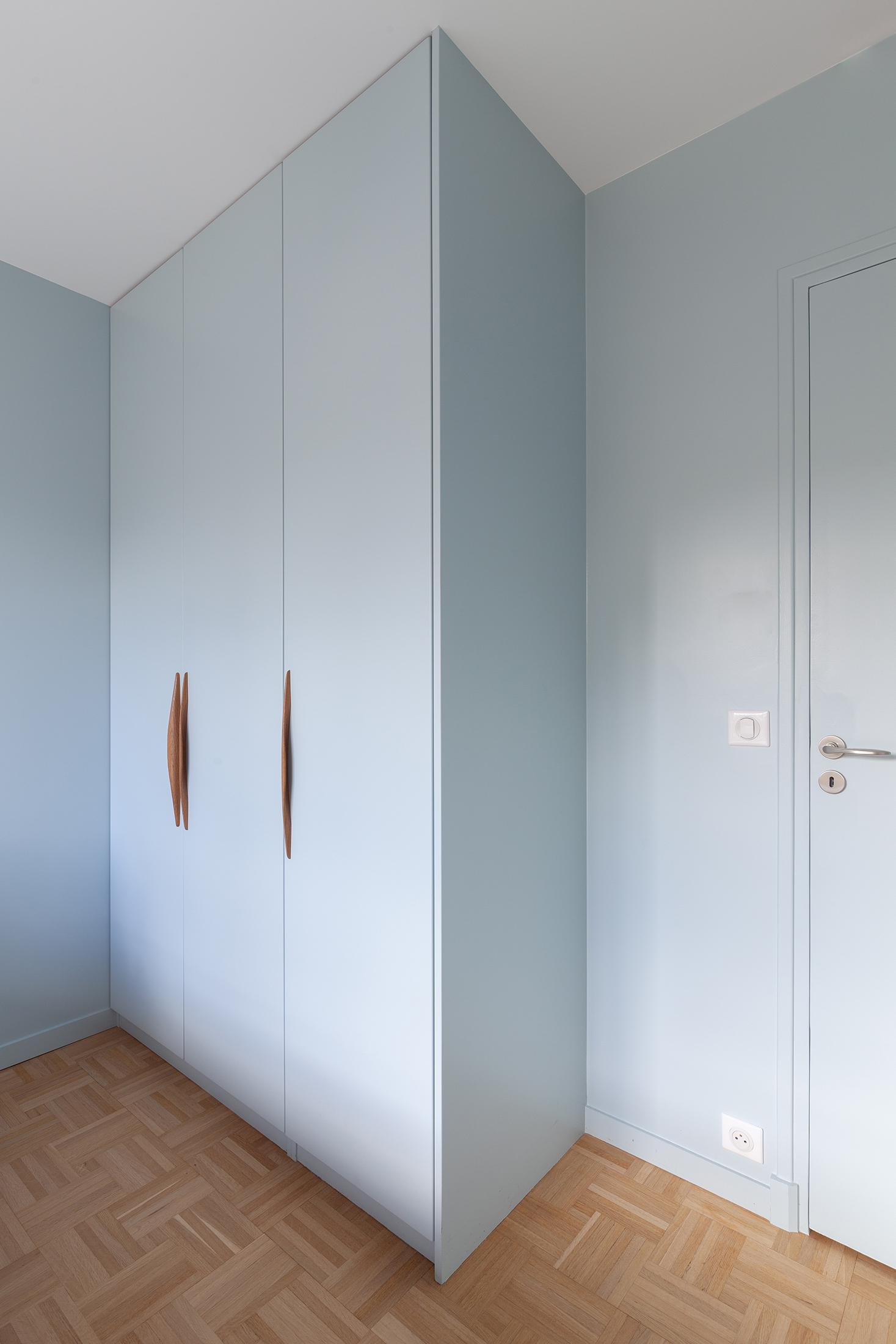 Côté nuit, les chambres ont toutes été optimisées avec de grands placards et les salles de bain réorganisées pour être plus fonctionnelles. Ces espaces sont modernisés grâce d’une part à l’utilisation de matériaux nobles et durables tels que le terrazzo et le chêne dans la salle d’eau parentale et d’autre part à l’utilisation de couleurs douces qui redonnent de l’élégance et de la sobriété au coin nuit de cet appartement.