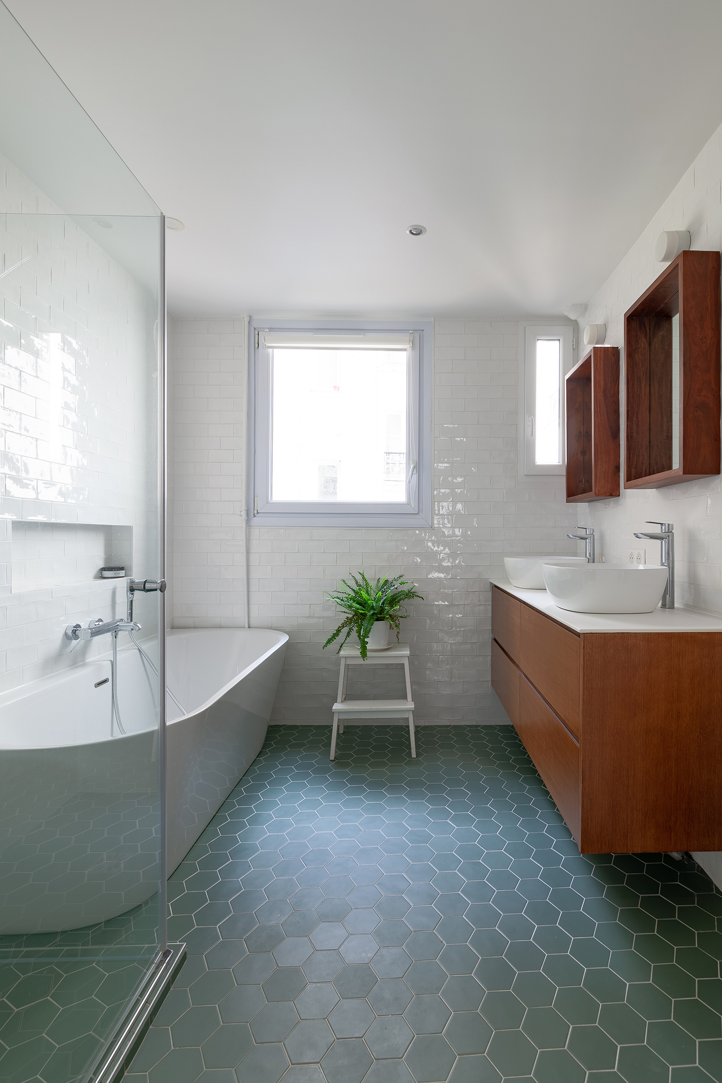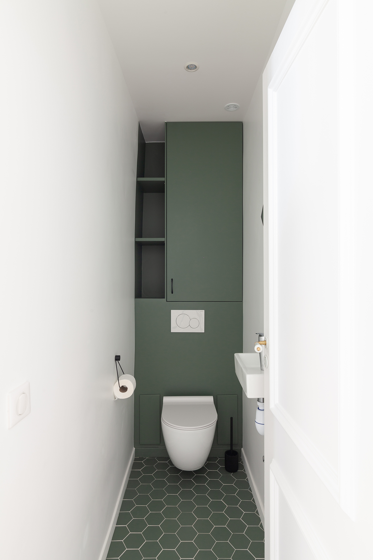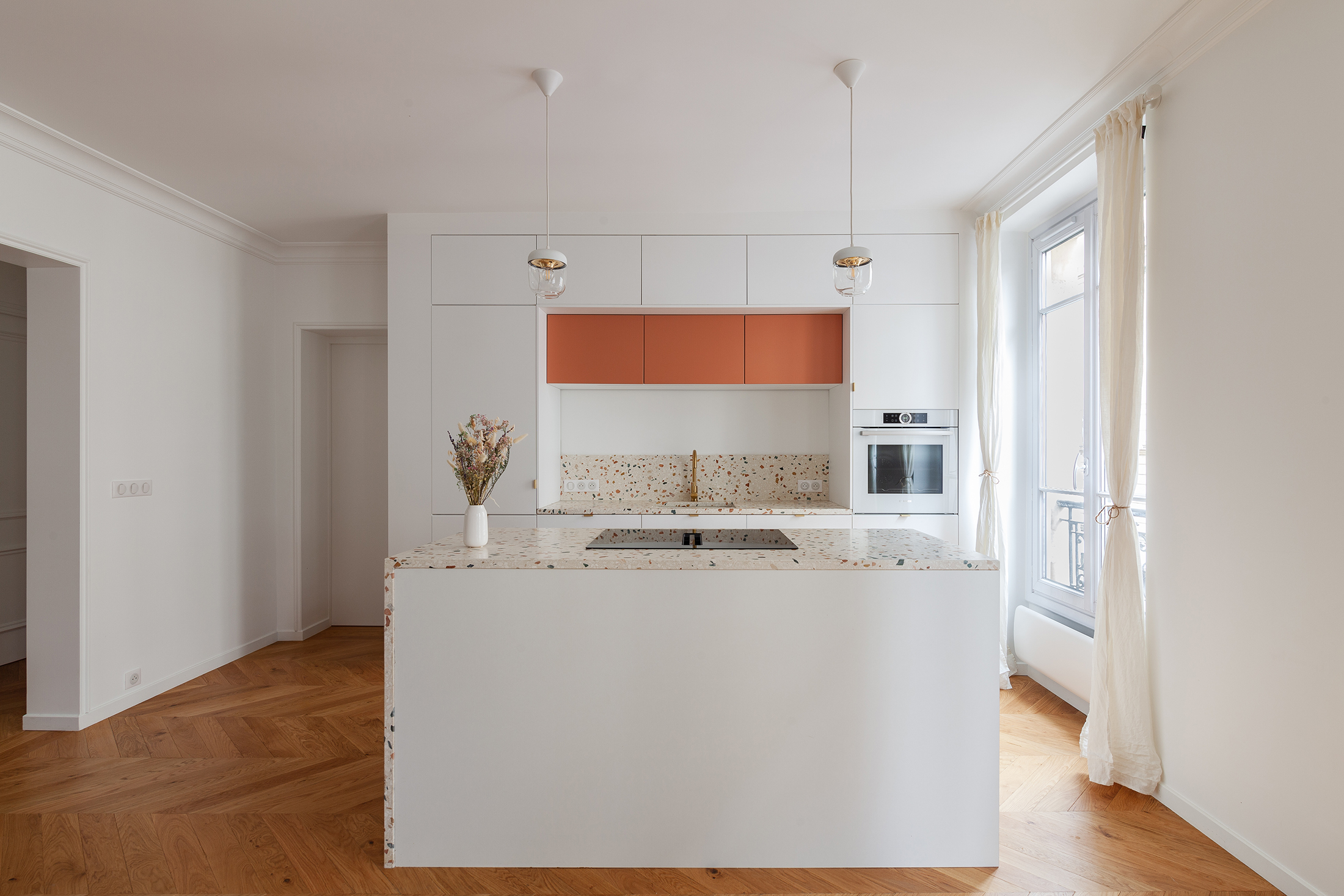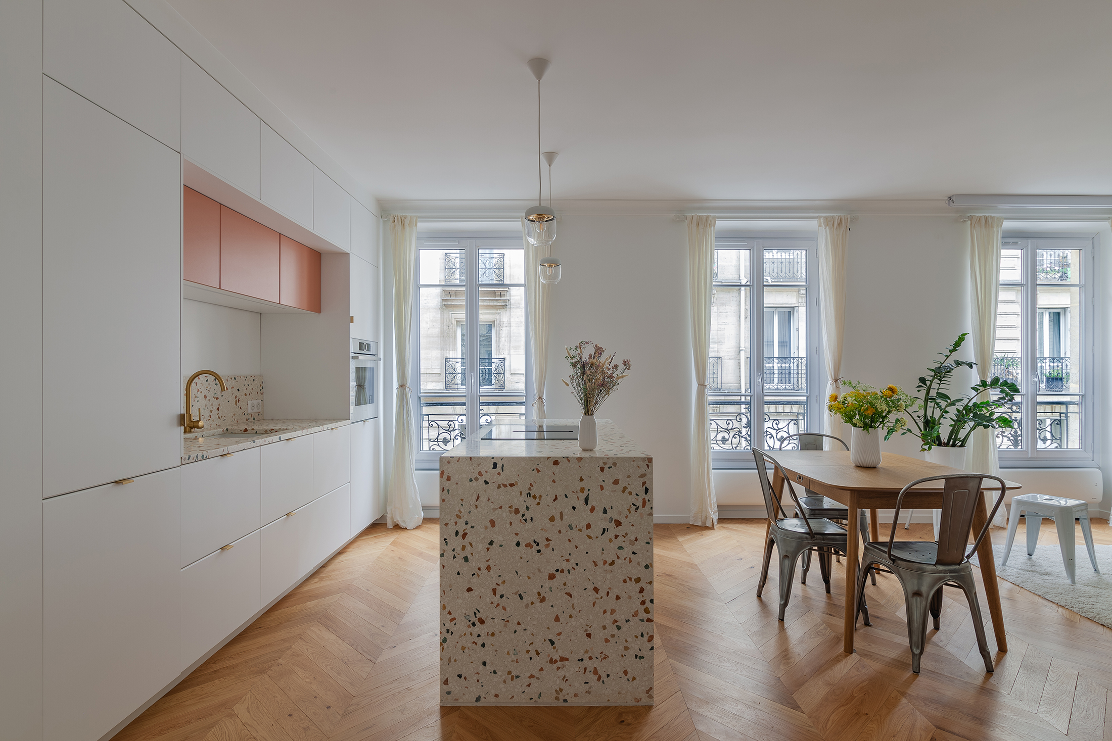 La pose d’un parquet pointe de Hongrie, d’une cheminée en marbre et de moulures redonnent à cet appartement un style haussmannien, modernisé par des menuiseries sur mesure, des matériaux tel que le terrazzo ou encore des touches de couleurs.