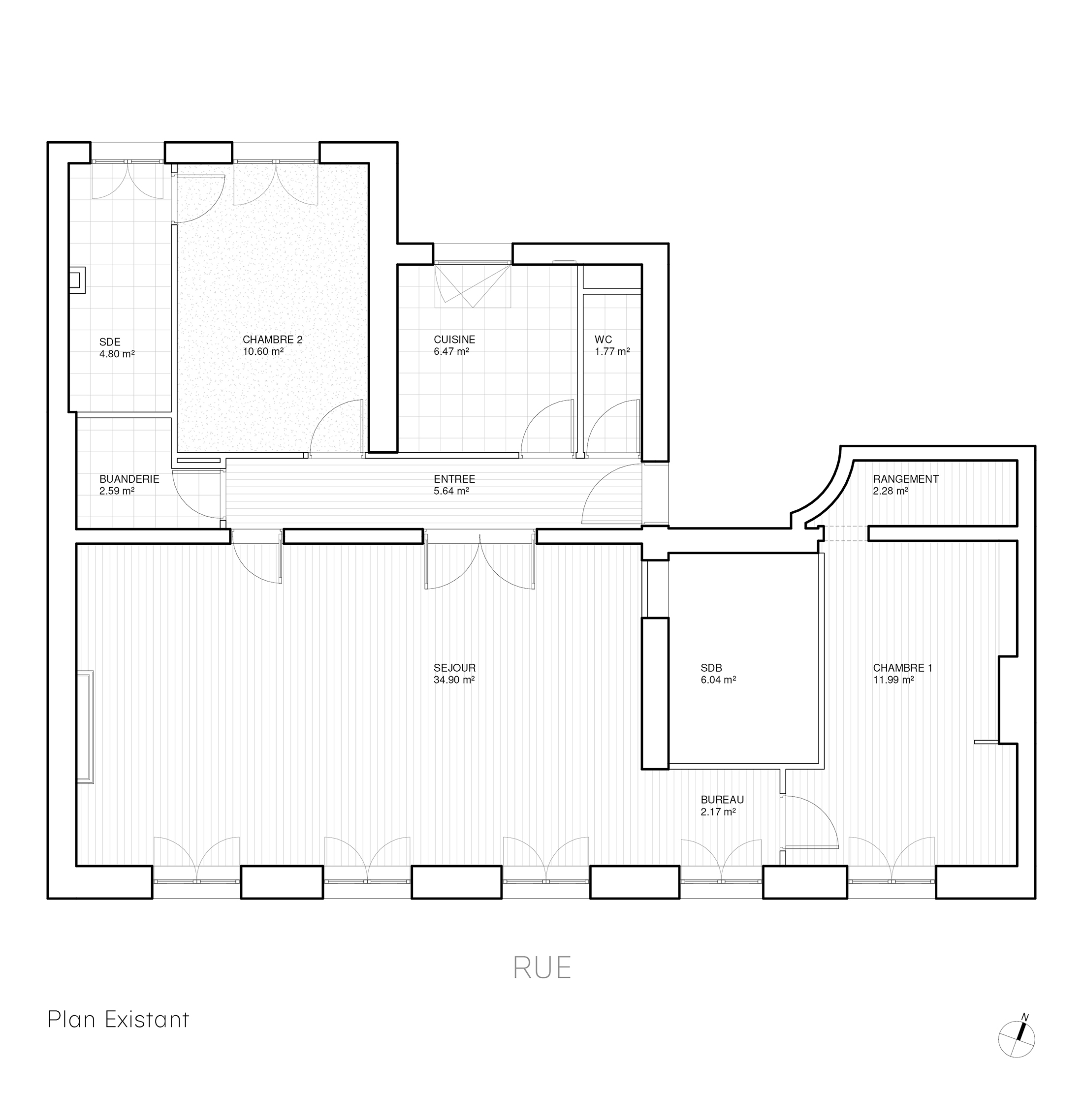 La cuisine fermée a été déplacée dans le séjour et fait maintenant partie intégrante de la pièce de vie. Les différents espaces s’articulent autour de l’ilot central. Un jeu de cadrage accentué par des moulures offre transparence et fluidité entre l’espace nuit, la circulation et la pièce de vie. La création d’une grande salle de bain familiale dans l’ancienne cuisine permet de libérer l’espace et ainsi créer deux grandes chambres. Celle des enfants sera modulable et pourra être divisée à l’avenir.