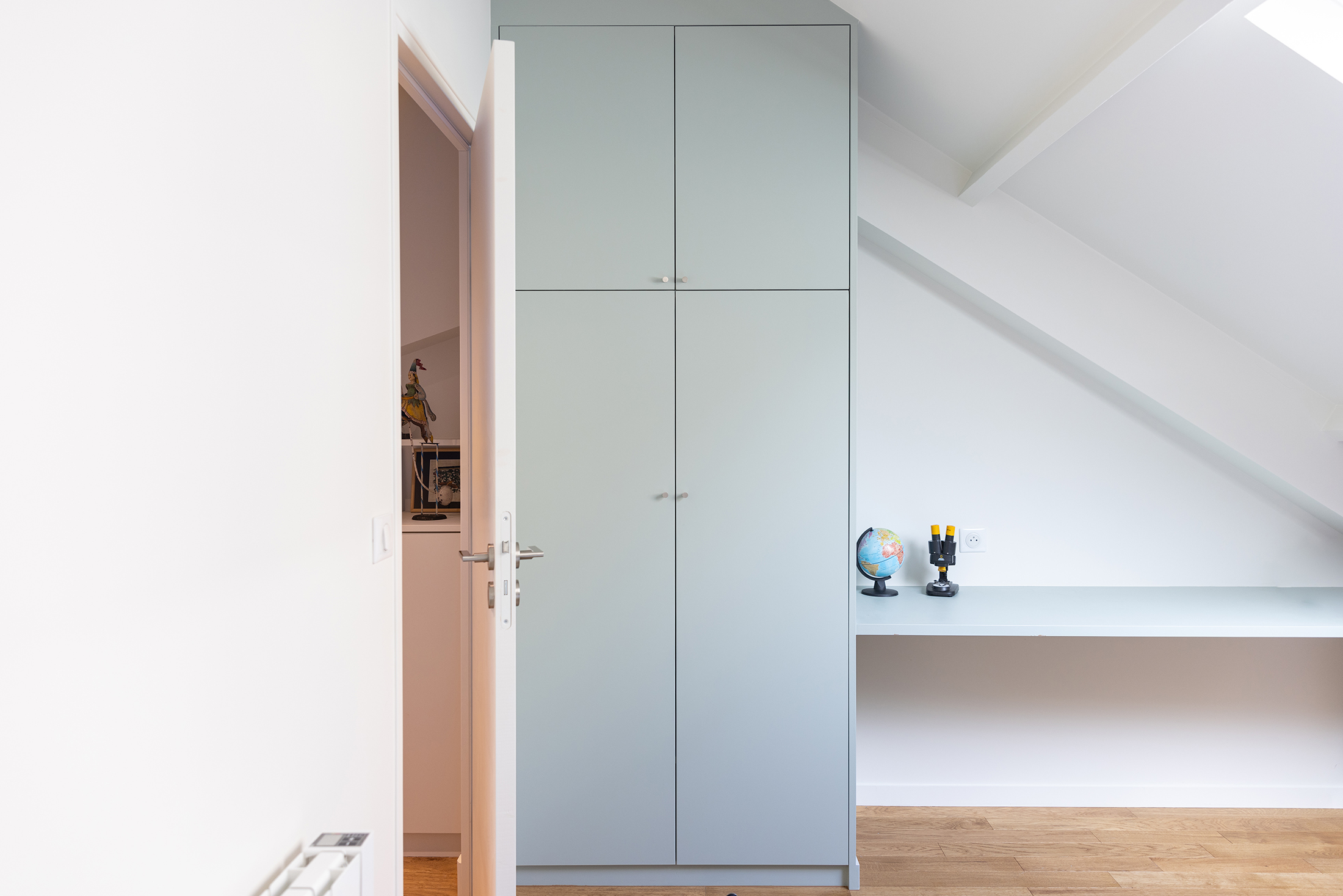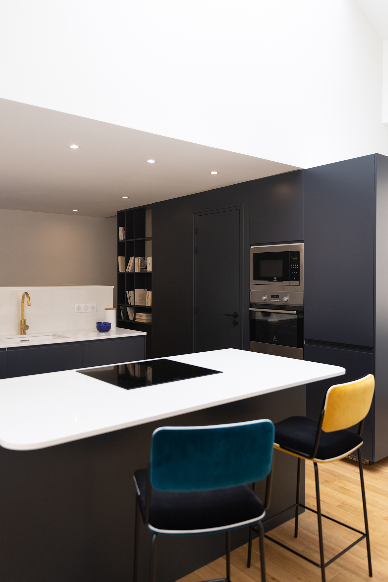 La cuisine trouve sa nouvelle place à l’entrée de ce niveau intermédiaire et agit comme point d’articulation entre les nouveaux WC, du rangement, et un accès discret à l’escalier menant à la troisième chambre. La teinte sombre et assumée de ce noyau central confère une touche contemporaine et élégante à ce triplex.