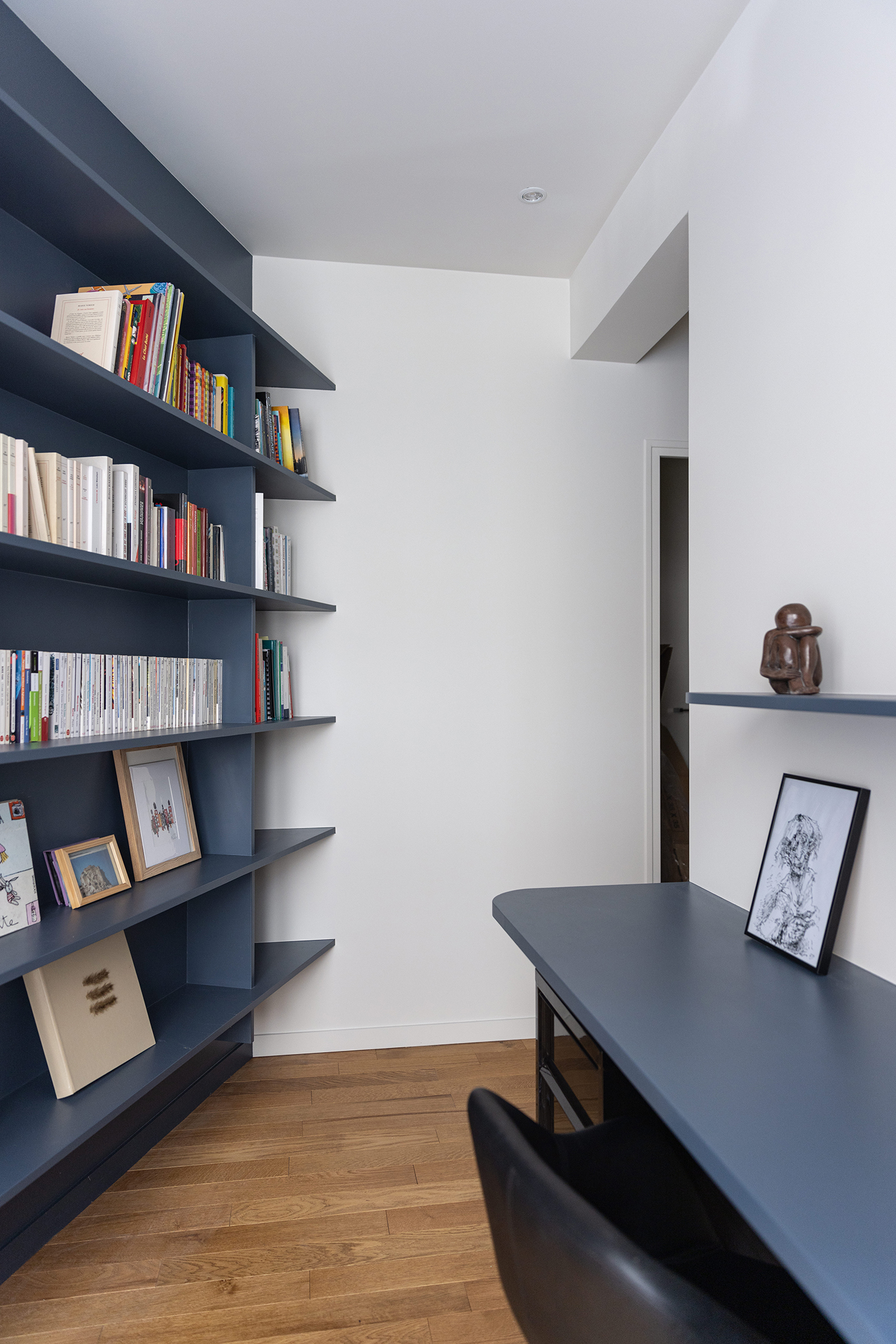 Pour cela, une des chambres a été déplacée au troisième niveau, permettant de réorganiser l’espace nuit en agrandissant les autres chambres et en créant un bureau assorti d’une bibliothèque. La pièce de vie a été aménagée avec sobriété afin de mettre en valeur son volume généreux. La lumière zénithale provenant de la verrière rénovée sublime cette pièce de vie en double hauteur.