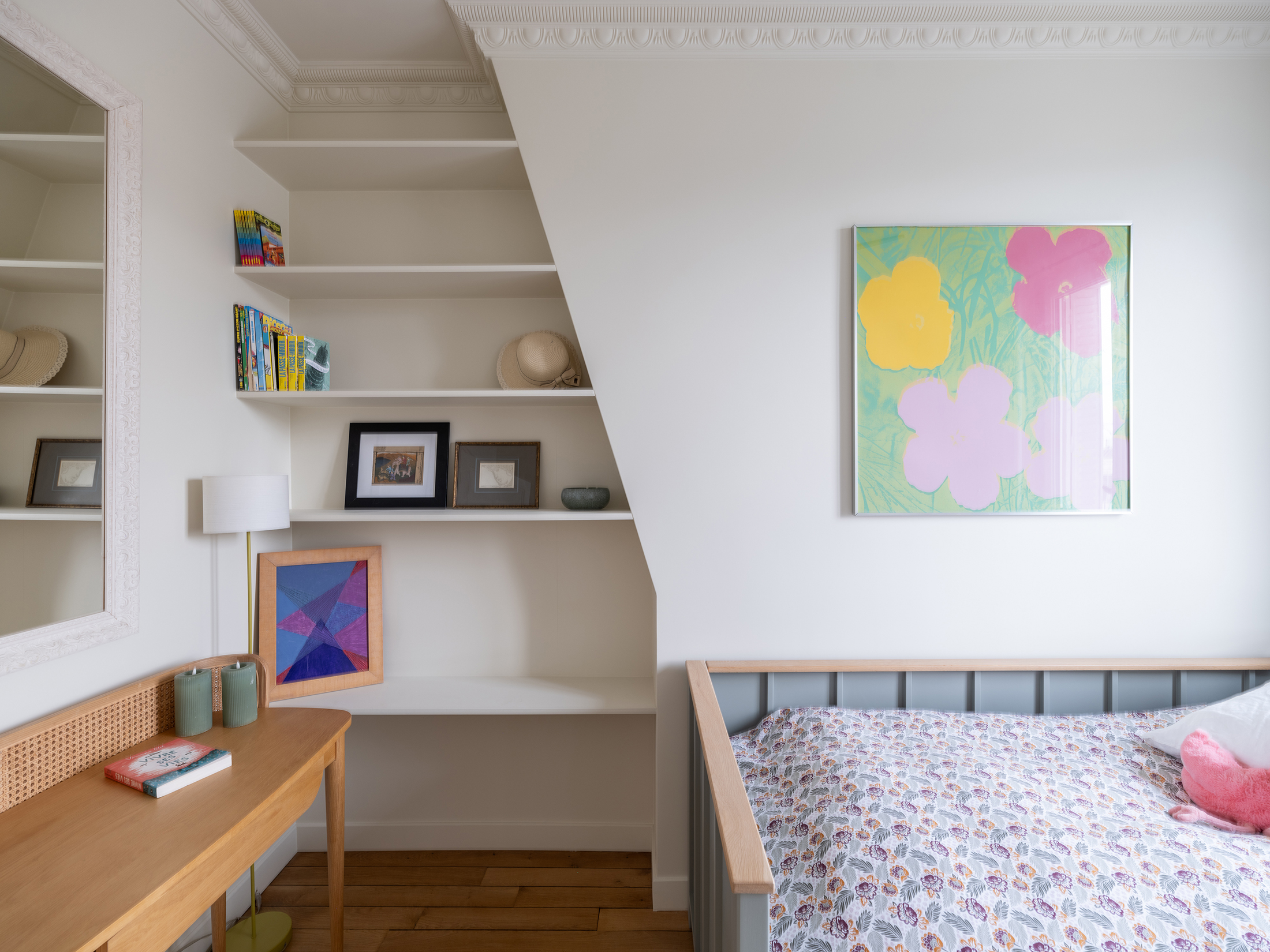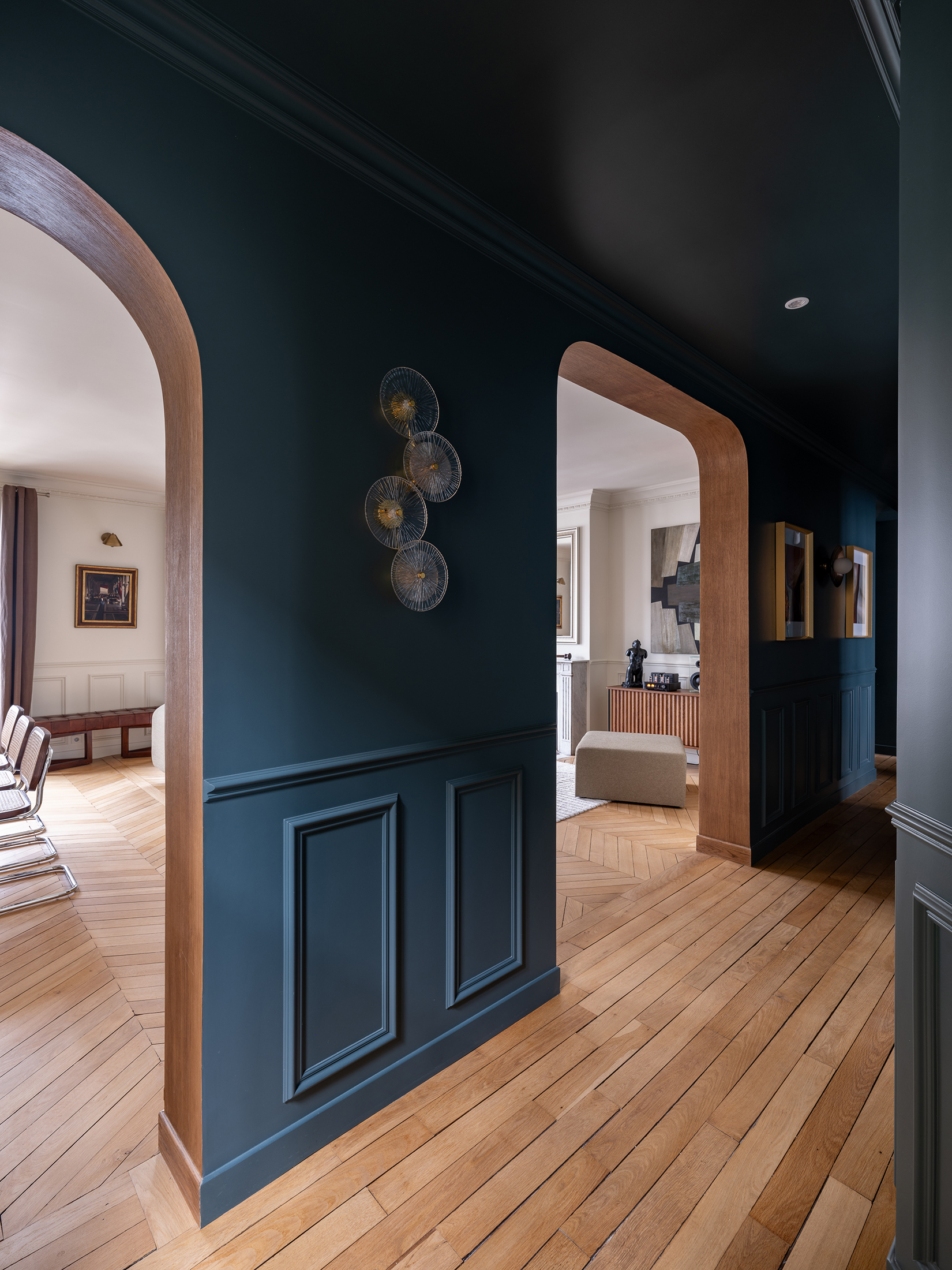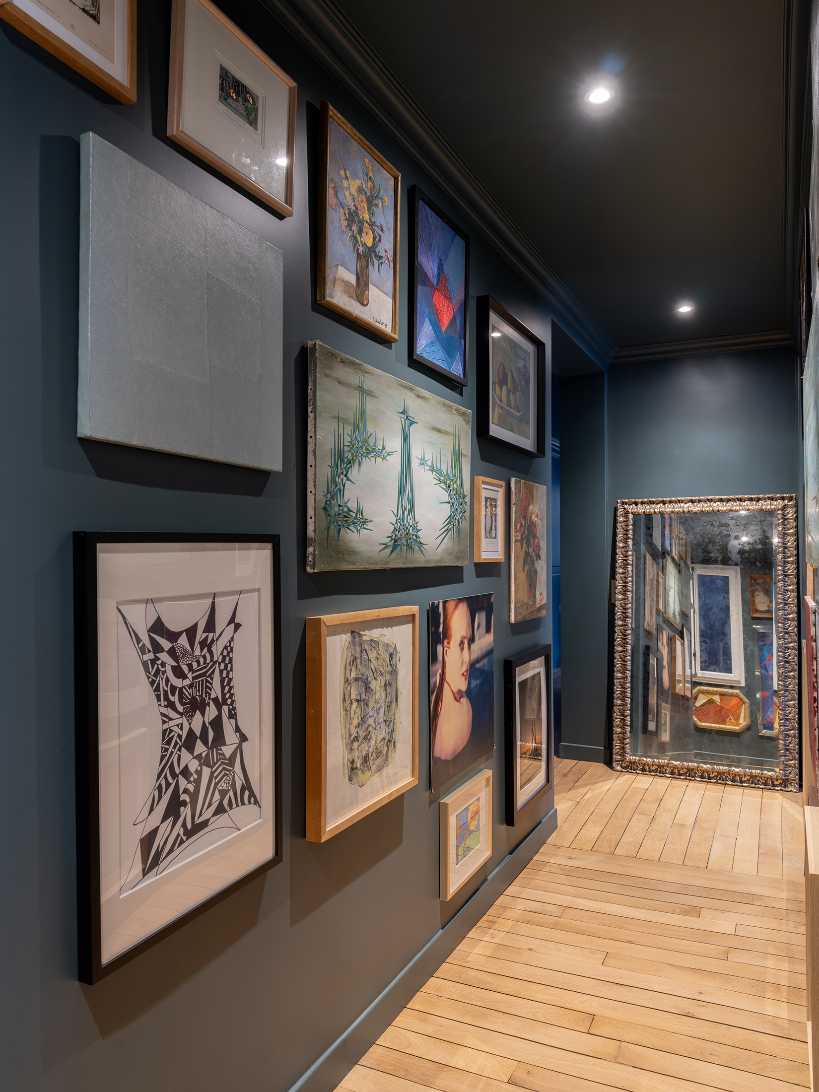 La circulation, parée d’une couleur feutrée, accueille une collection d’œuvres d’art. Elle n’est plus seulement un lieu de passage, elle devient un véritable lieu de vie et de contemplation.