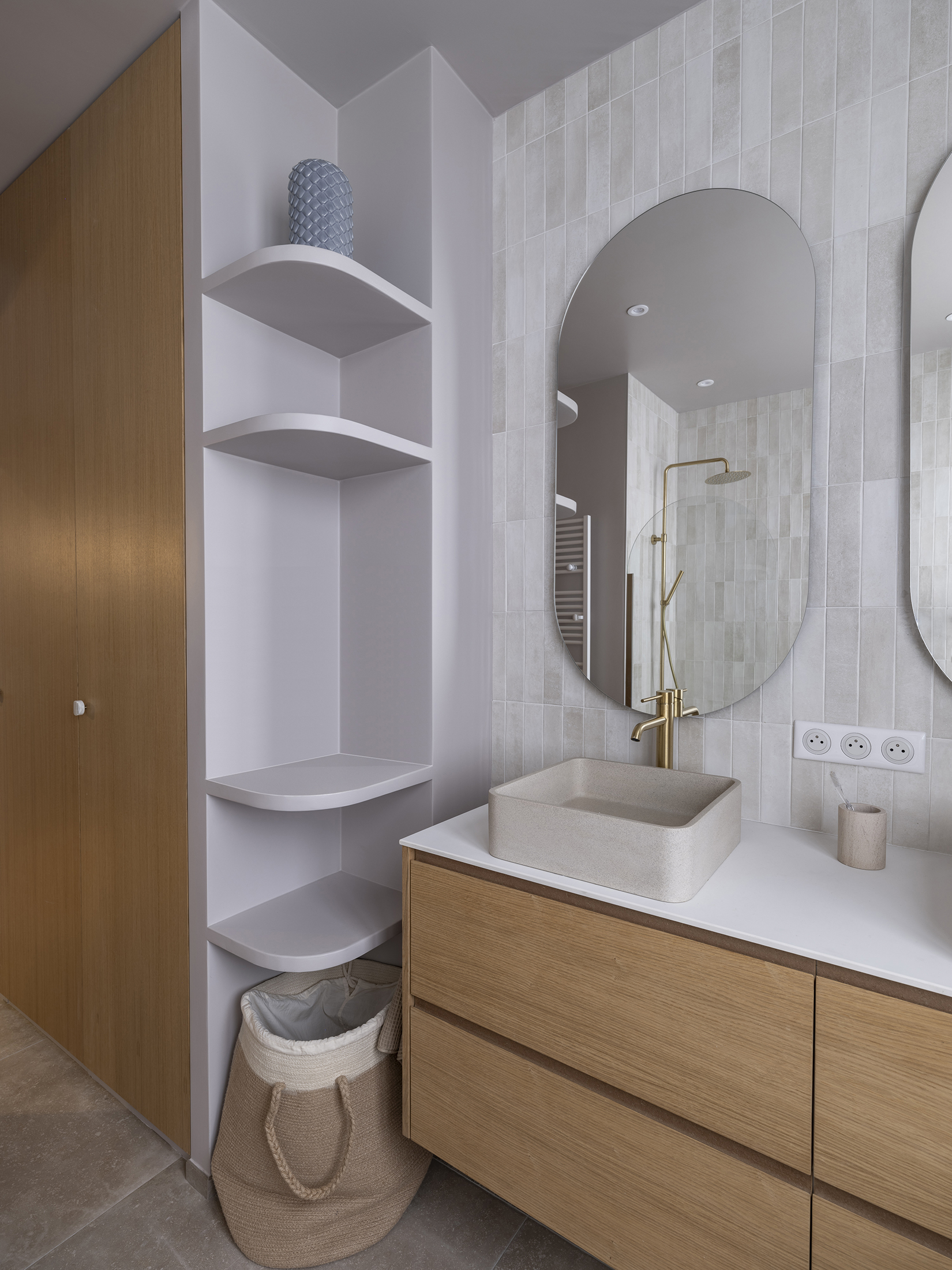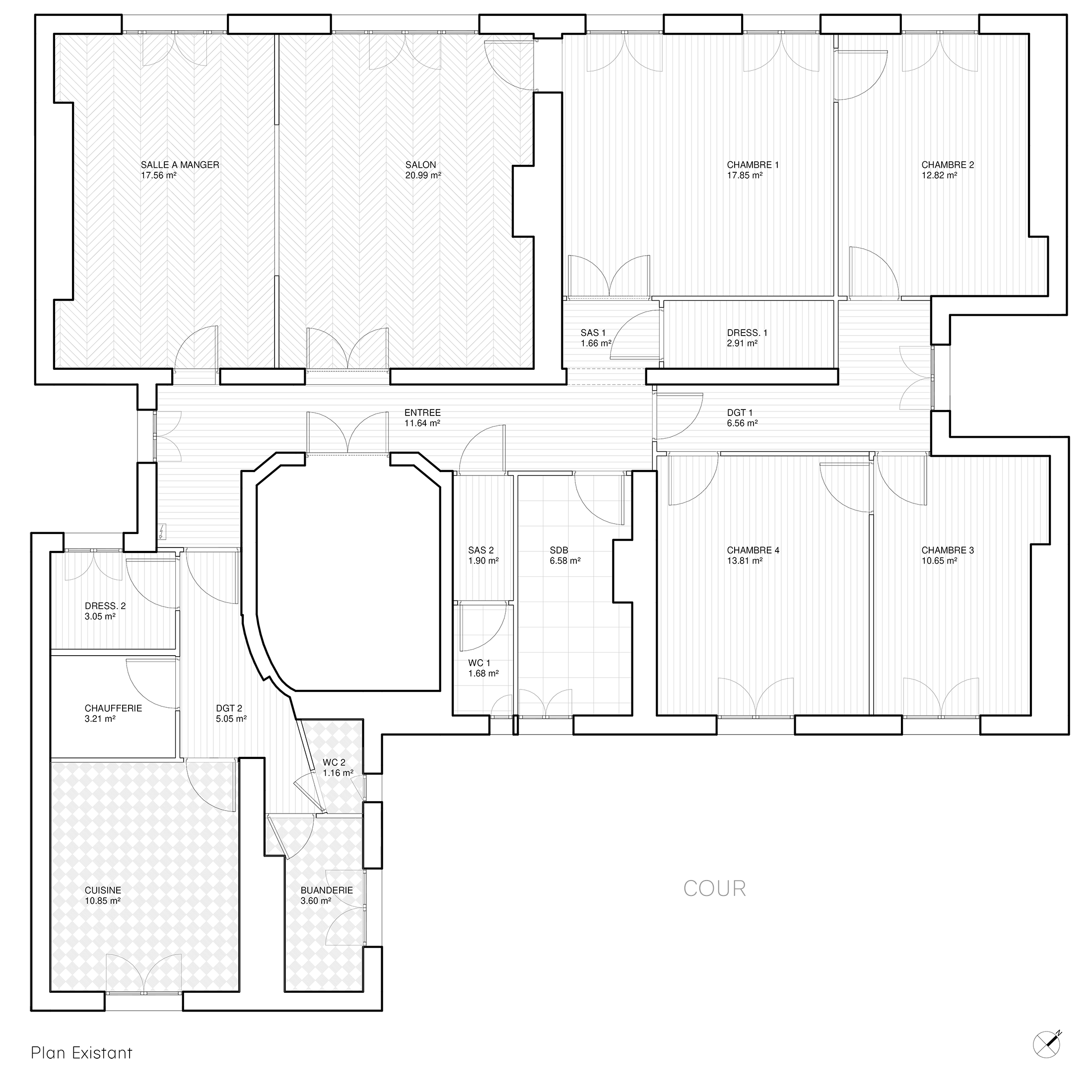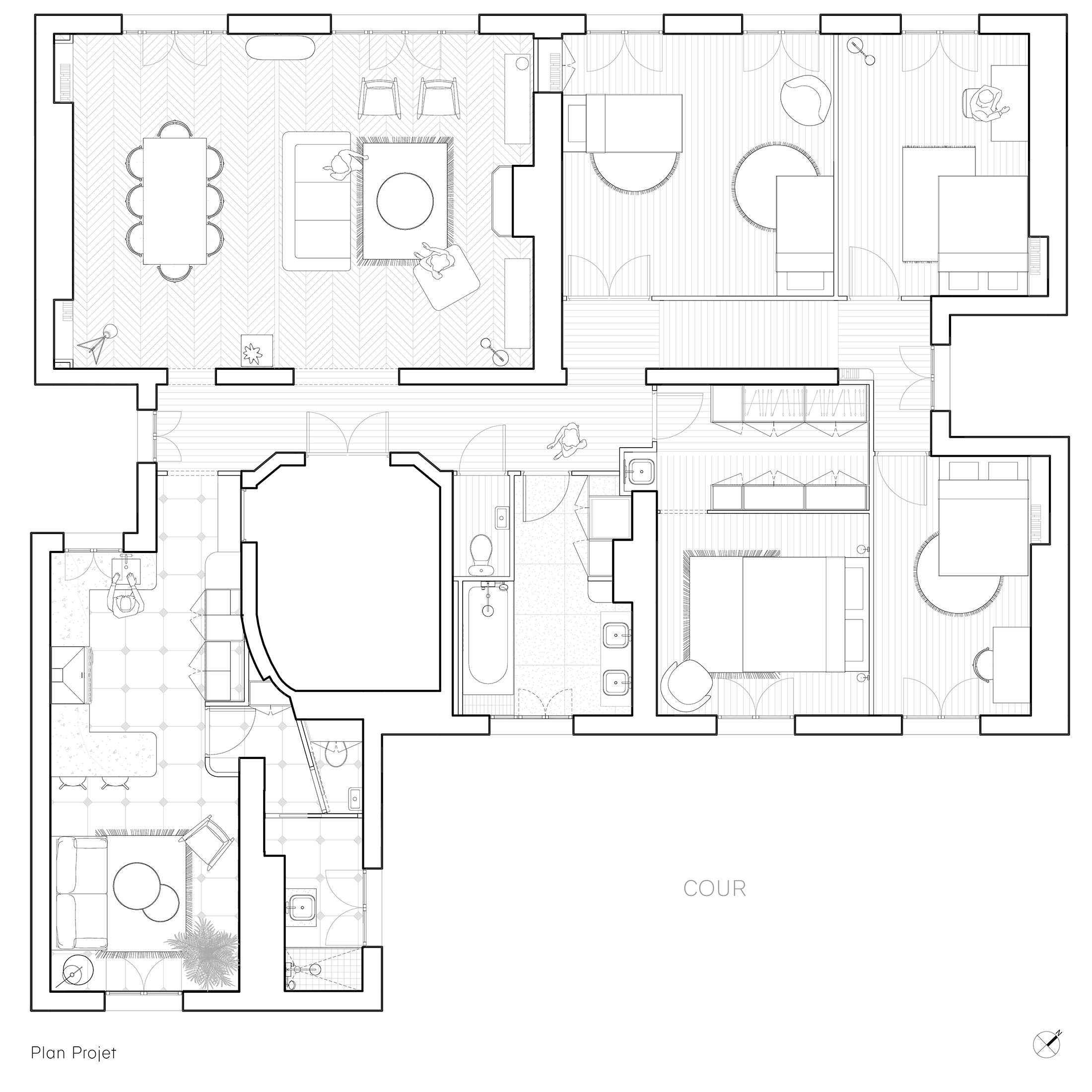 Le noyau comprenant les pièces de service a été entièrement réorganisé pour devenir le cœur du foyer et un lieu de convivialité. Ce nouvel espace, désormais traversant, intègre une cuisine familiale ouverte sur un salon d’appoint. Coté nuit, une suite parentale ainsi qu’une salle d’eau supplémentaire ont été créées.