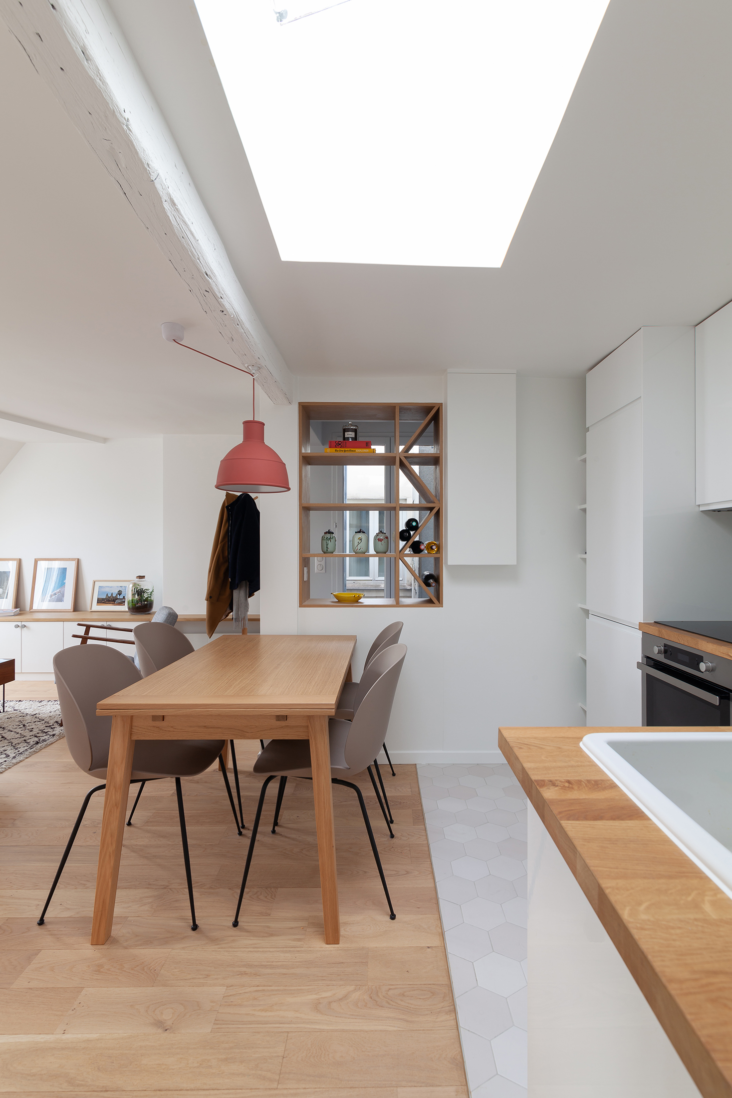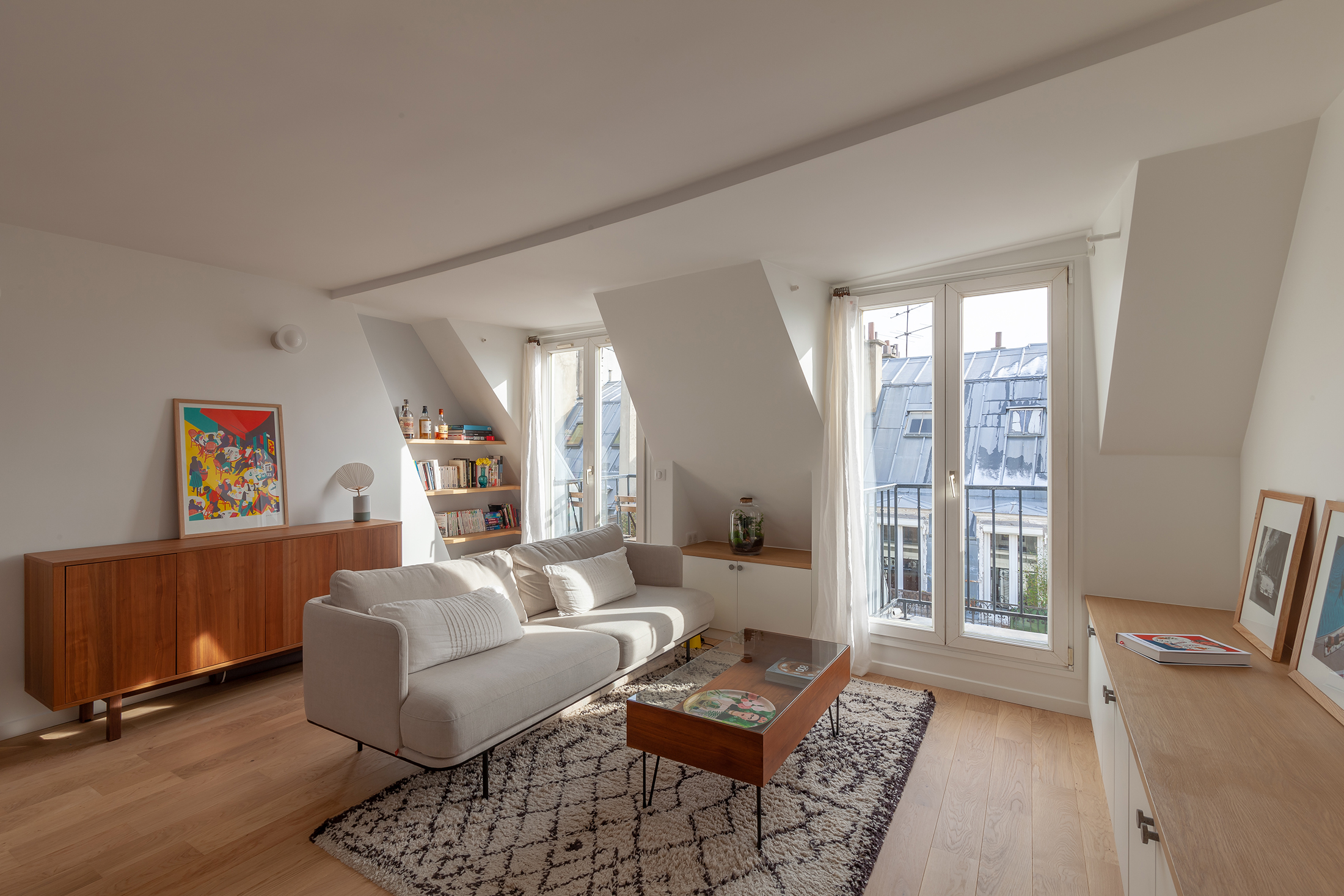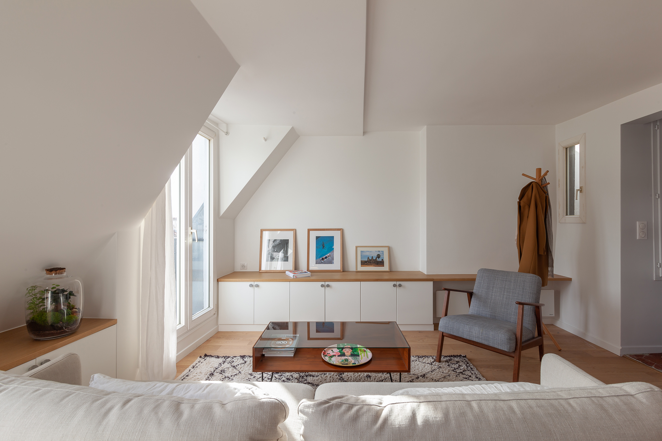 Du mobilier sur mesure a été conçu dans tous l’appartement afin d’offrir de nombreux rangements : un dressing sur mesure dans l’entrée, des rangements bas dans le séjour, soulignés par des tablettes en chêne, ou encore des placards créés sous les rampants répondent au souhait d’optimisation des propriétaires.