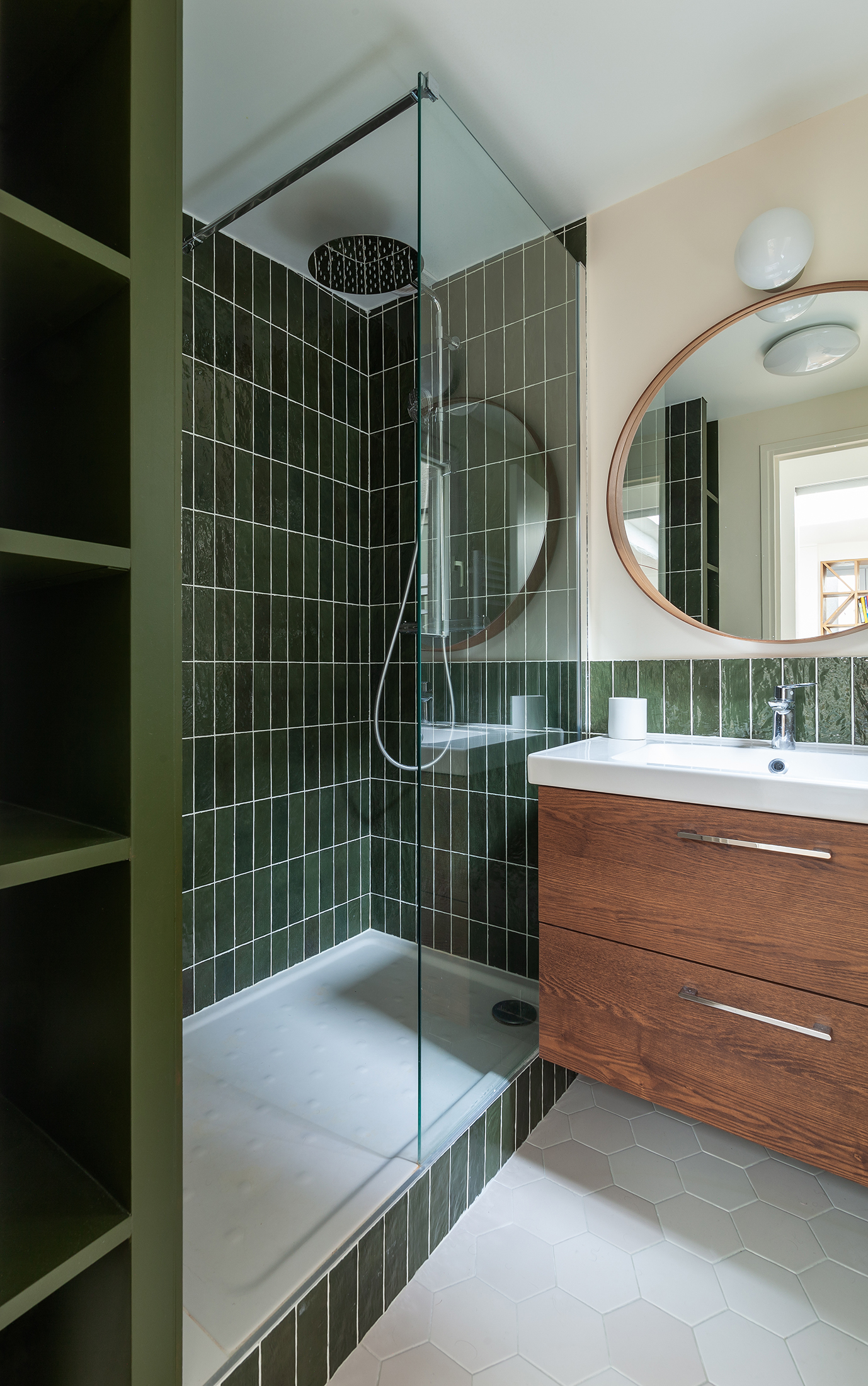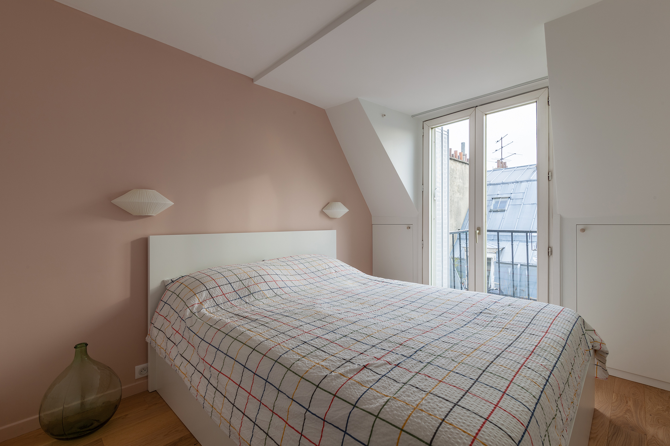 Le carrelage hexagonal de la cuisine et de la salle d’eau fait écho aux tommettes anciennes de l’entrée et au charme de cet appartement sous les toits. La couleur est utilisée ponctuellement dans la pièce de vie et vient réveiller les pièces d’eau et le coin nuit. Ainsi la niche de la chambre et le mur de la tête de lit se sont parés d’une teinte beige rosé offrant une ambiance cosy.
