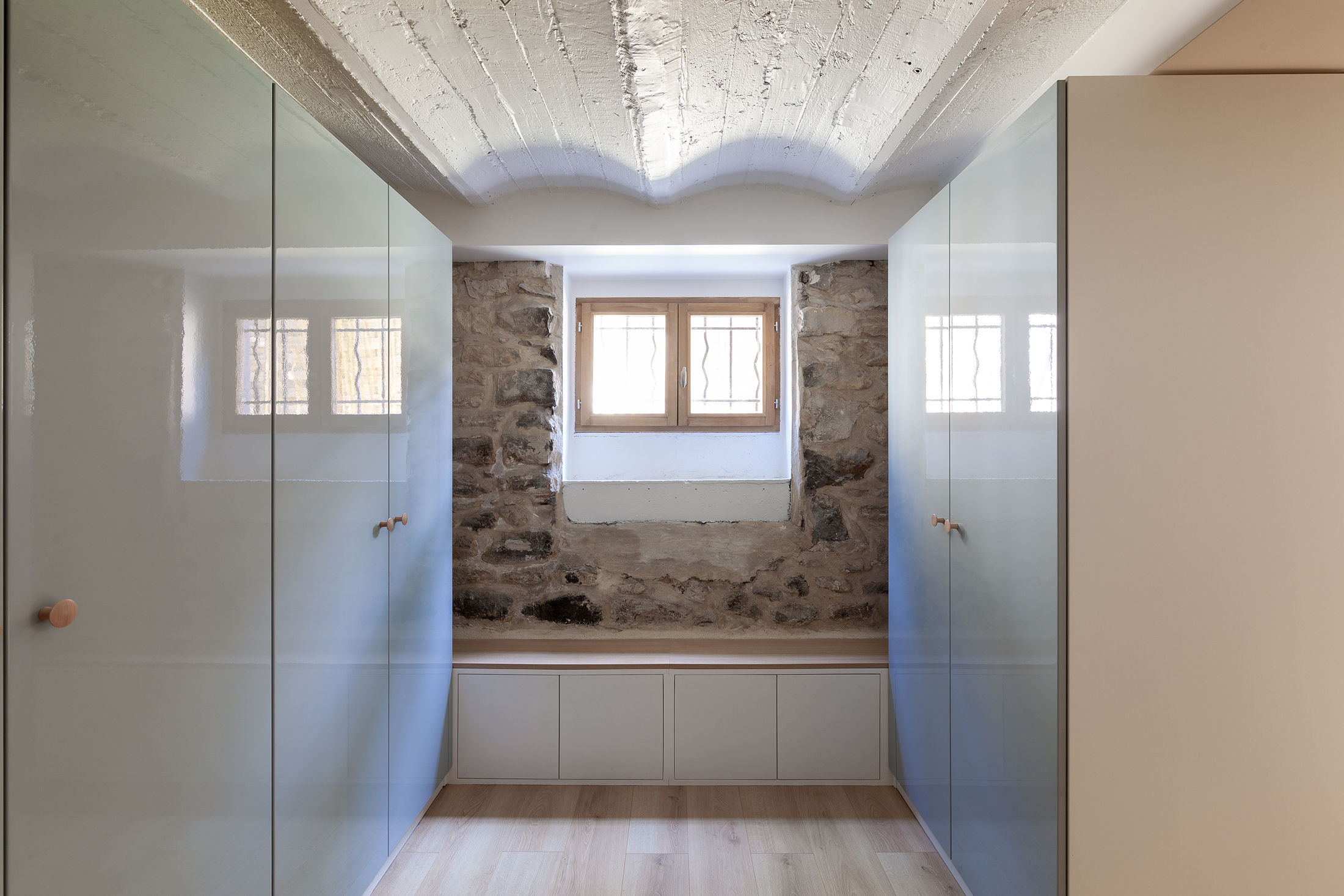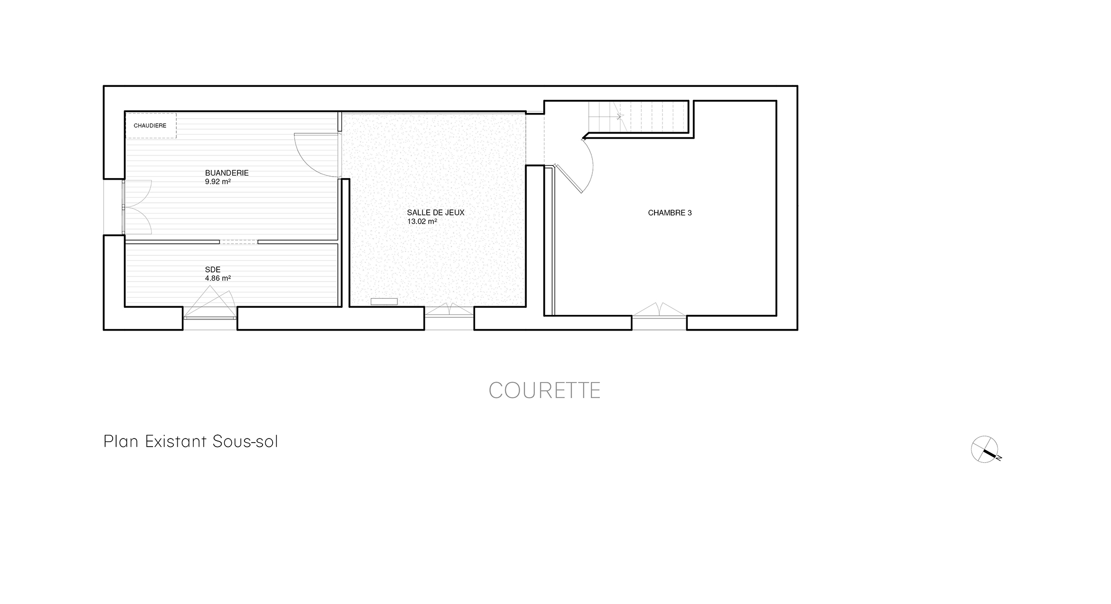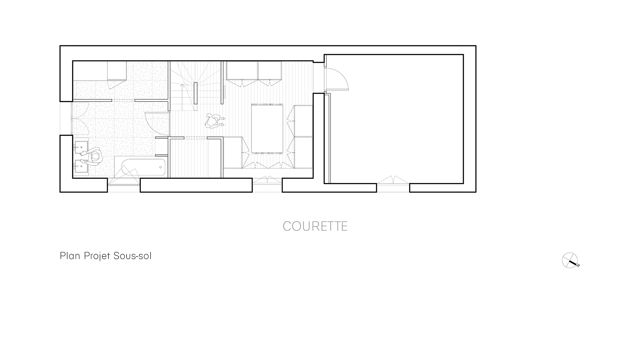 L’escalier central crée également un lien plus direct entre la chambre parentale au RDC et son grand dressing et sa salle de bain au sous-sol. Ce niveau, auparavant très sombre, a été rénové sobrement avec des teintes claires afin d’accentuer l’apport de lumière naturelle.