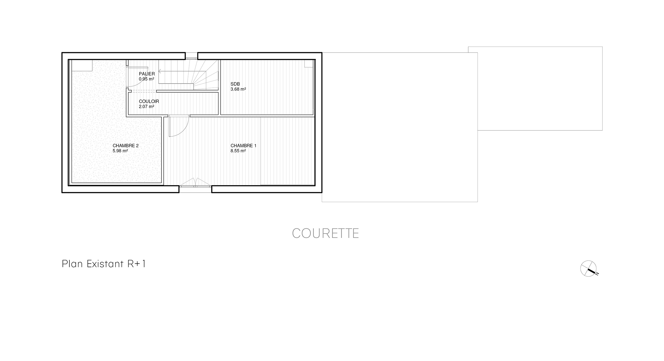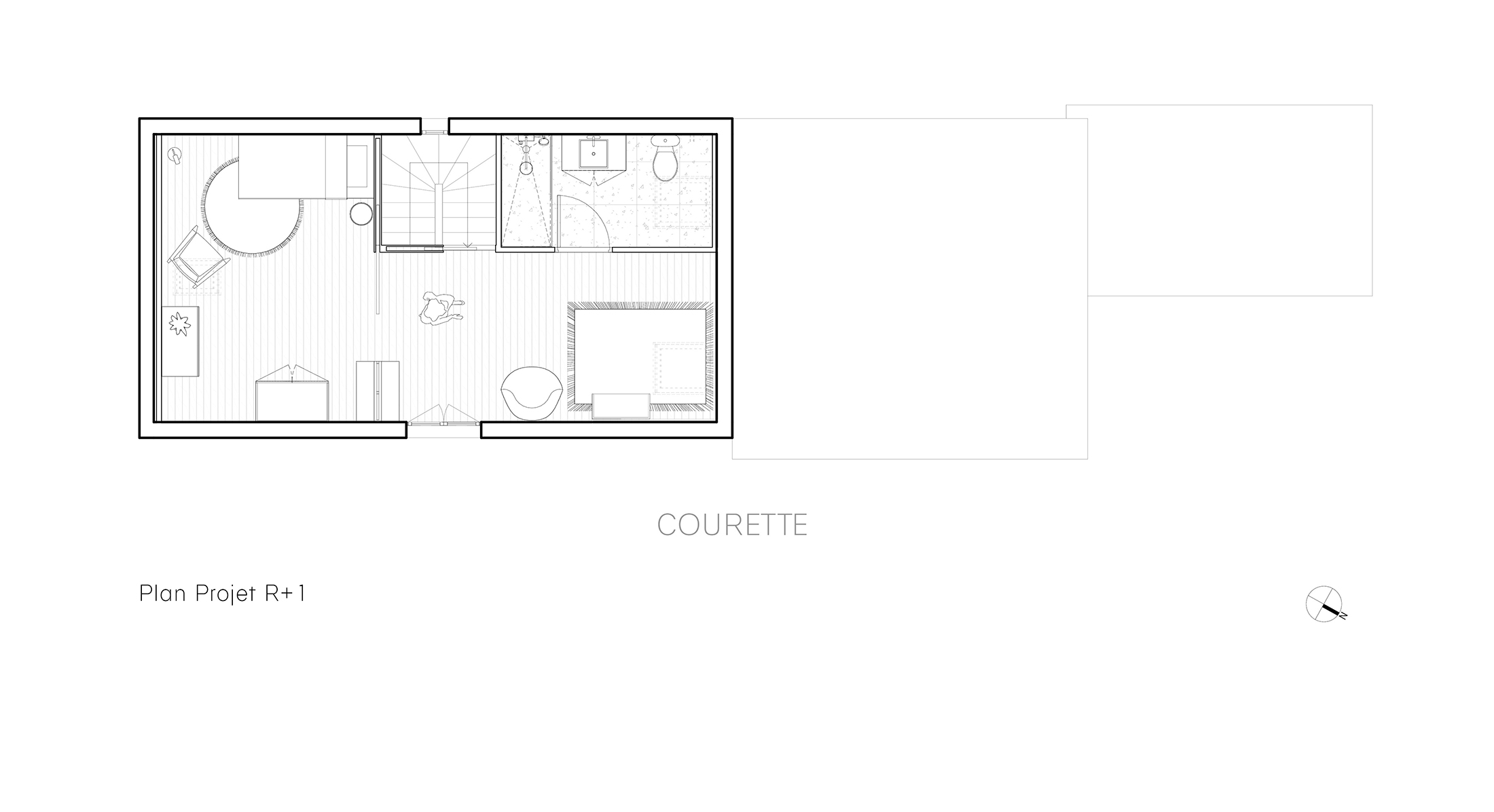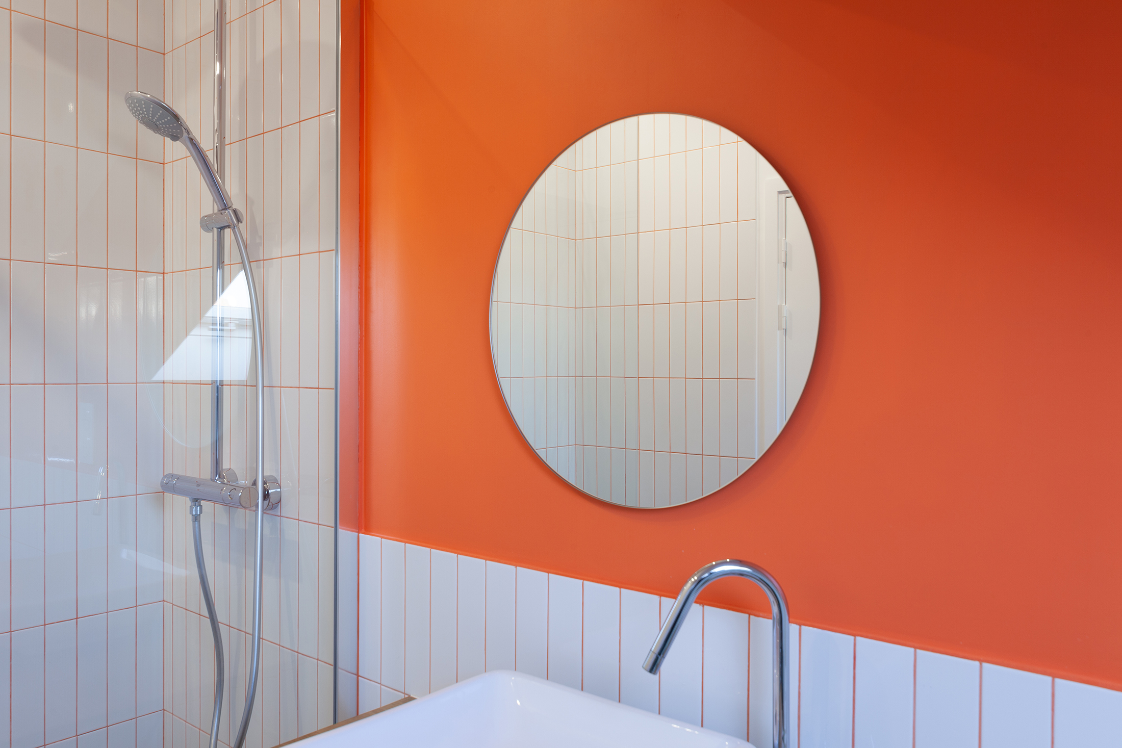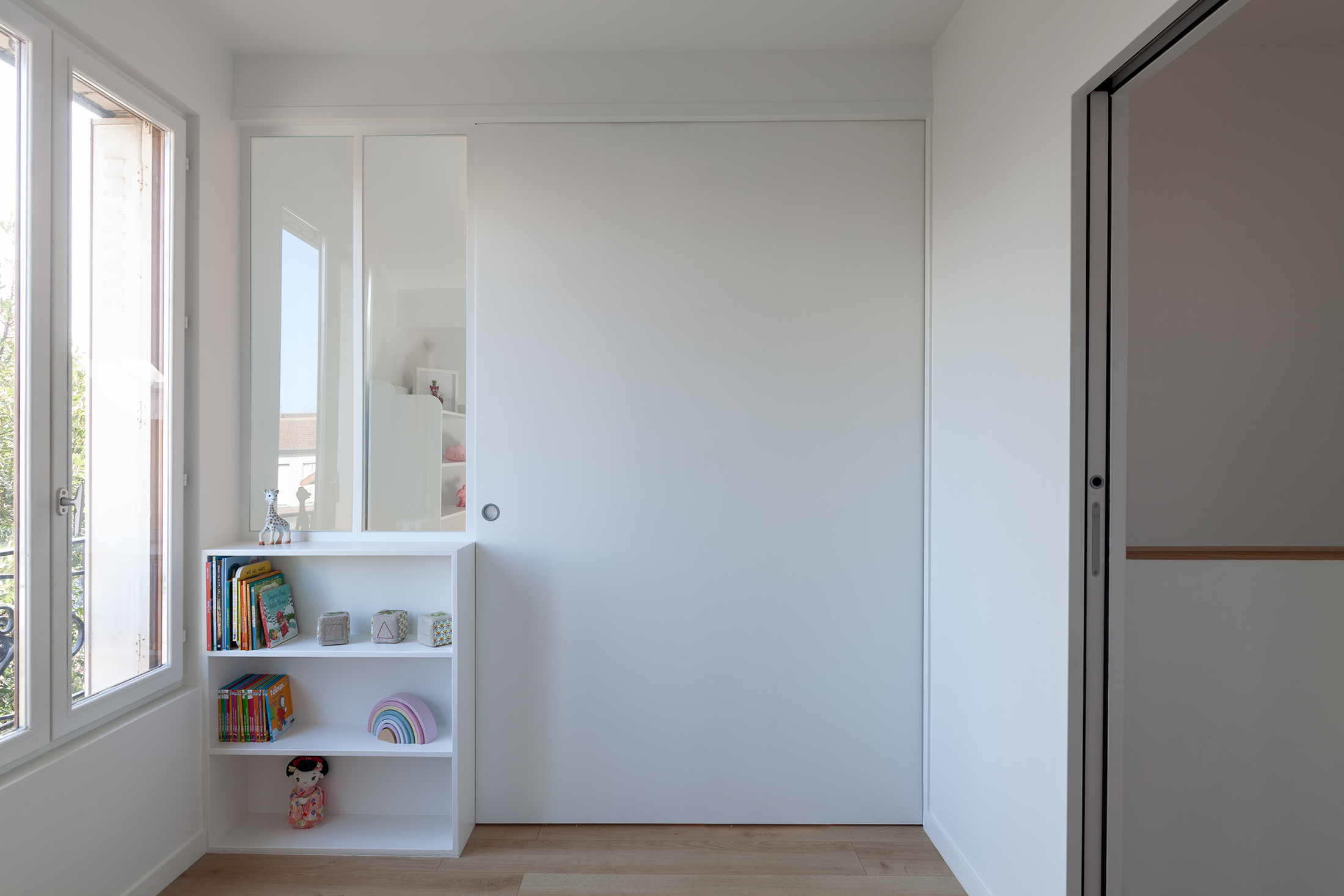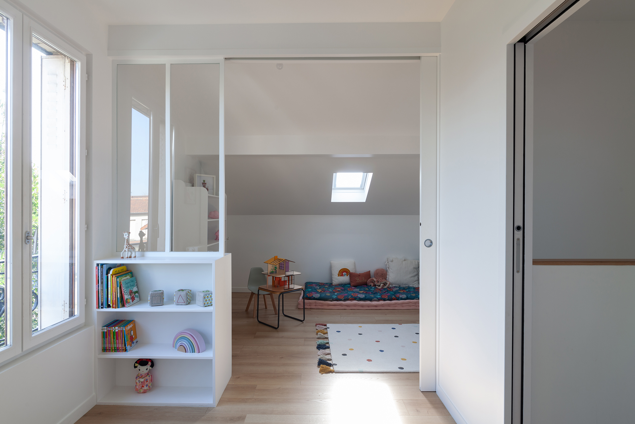 Au premier étage, la volonté des propriétaires était d’avoir un espace évolutif. Le volume existant est entièrement décloisonné pour créer une grande chambre d’enfant composée d’un coin nuit et d’un coin jeu. Elle pourra facilement évoluer en deux chambres grâce à la cloison coulissant sur mesure. Cet étage offre également une petite salle d’eau à l’esthétique graphique et pop.
