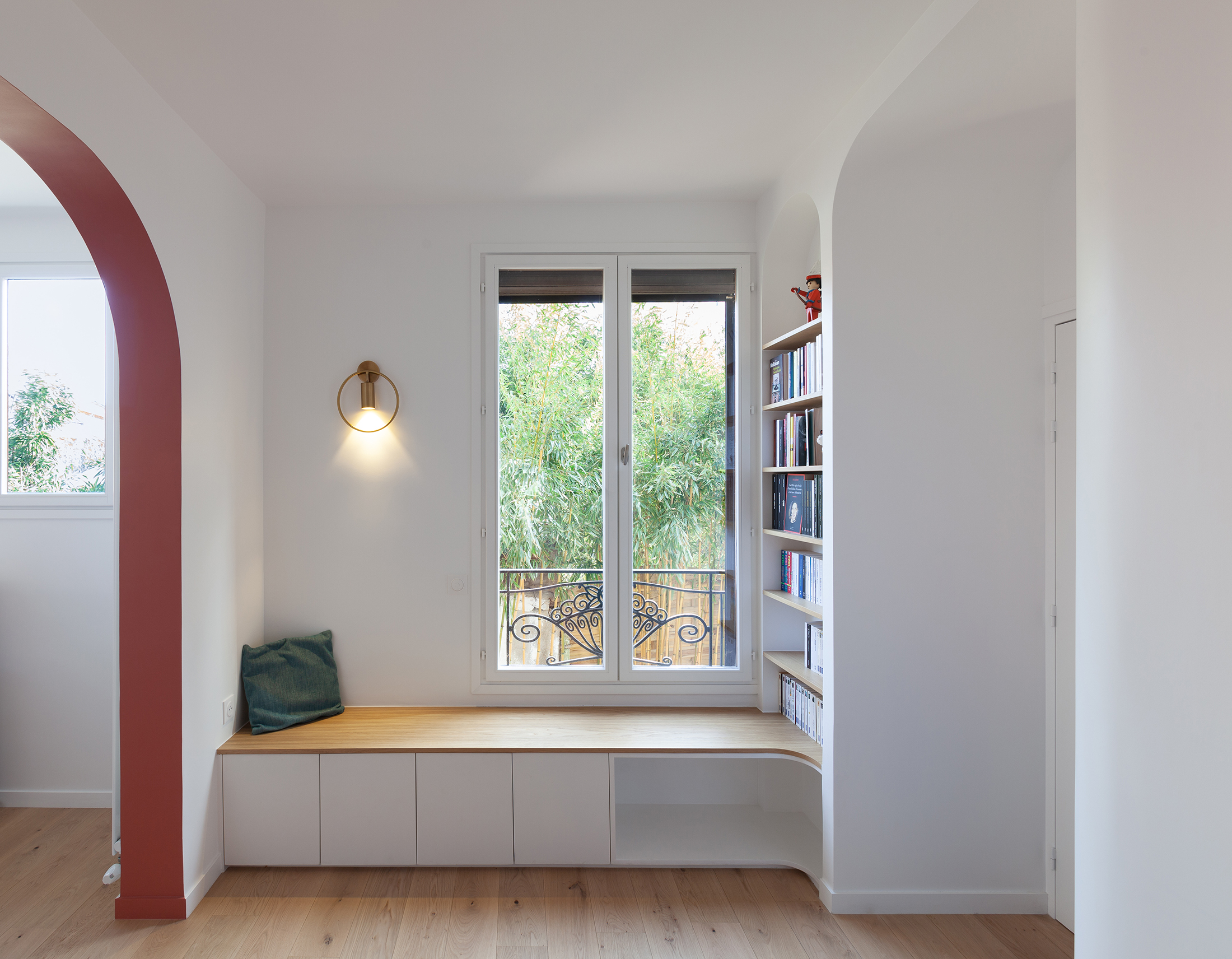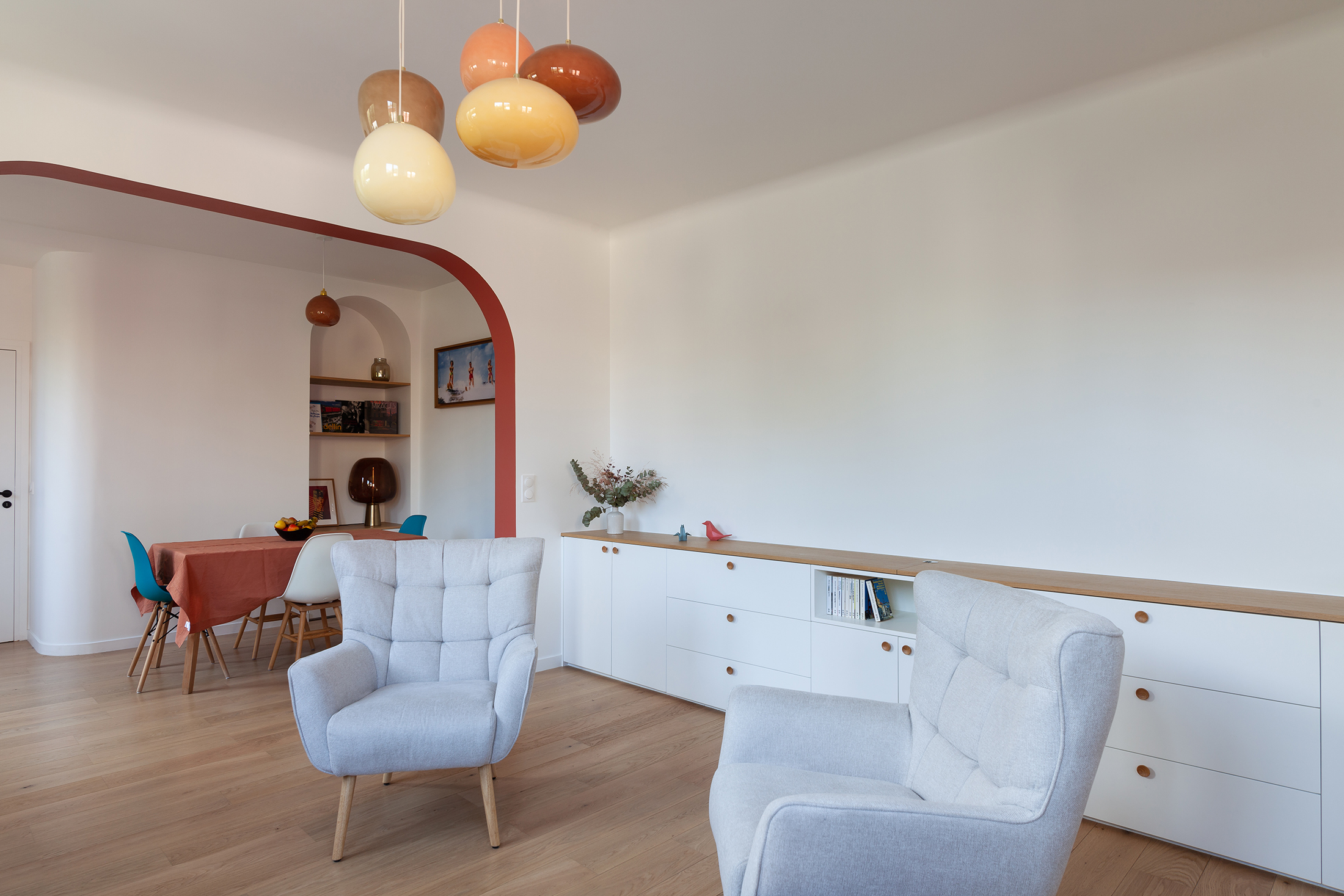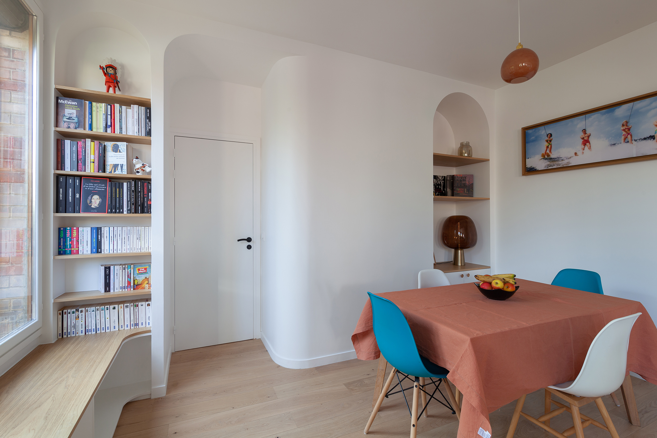 La forme de l’arche préexistante se décline notamment sur les niches et le volume des toilettes. Dans cette grande pièce à vivre, les menuiseries blanches avec des touches de chêne, permettent de séquencer l’espace discrètement tout en offrant un maximum de rangement.