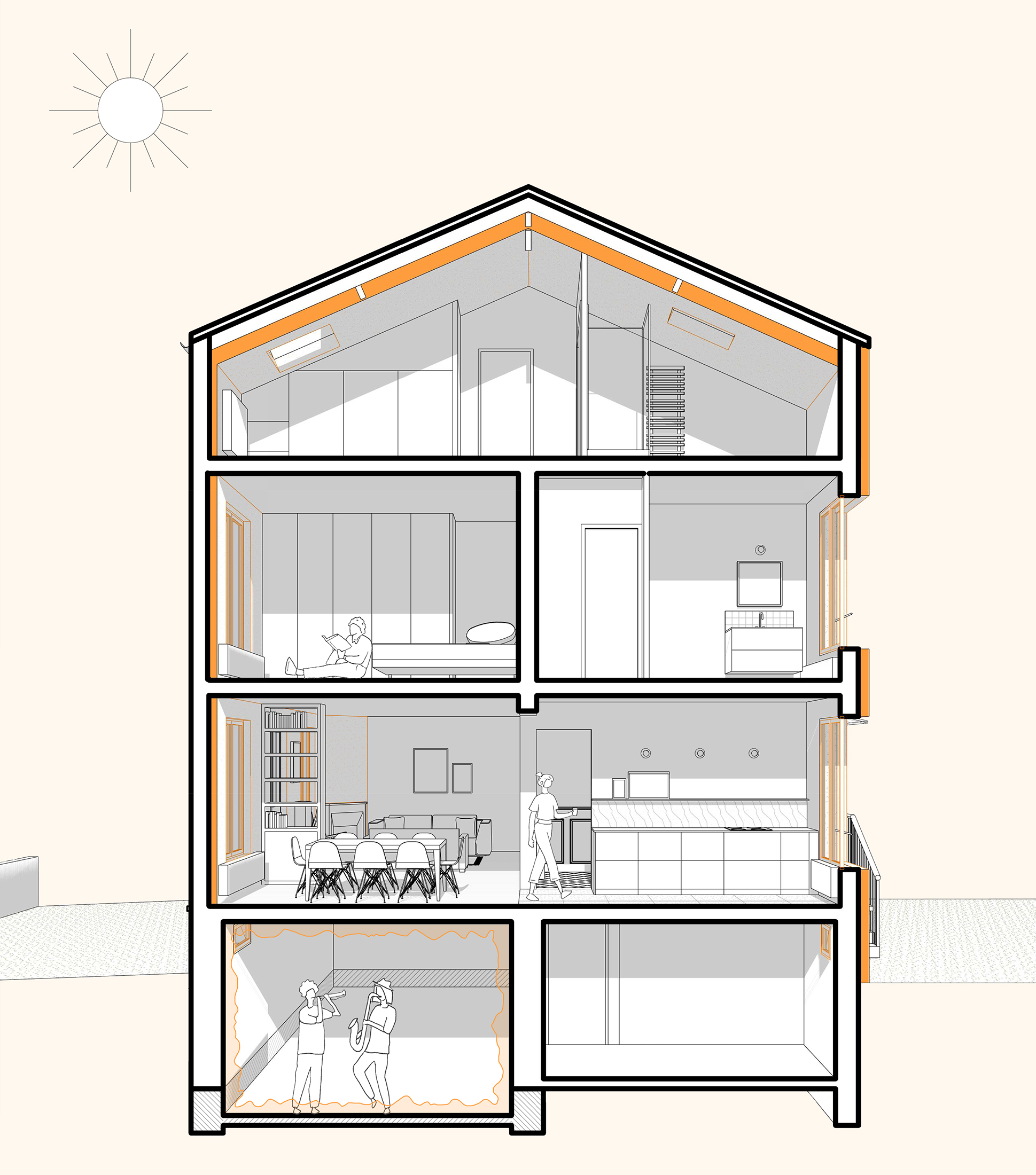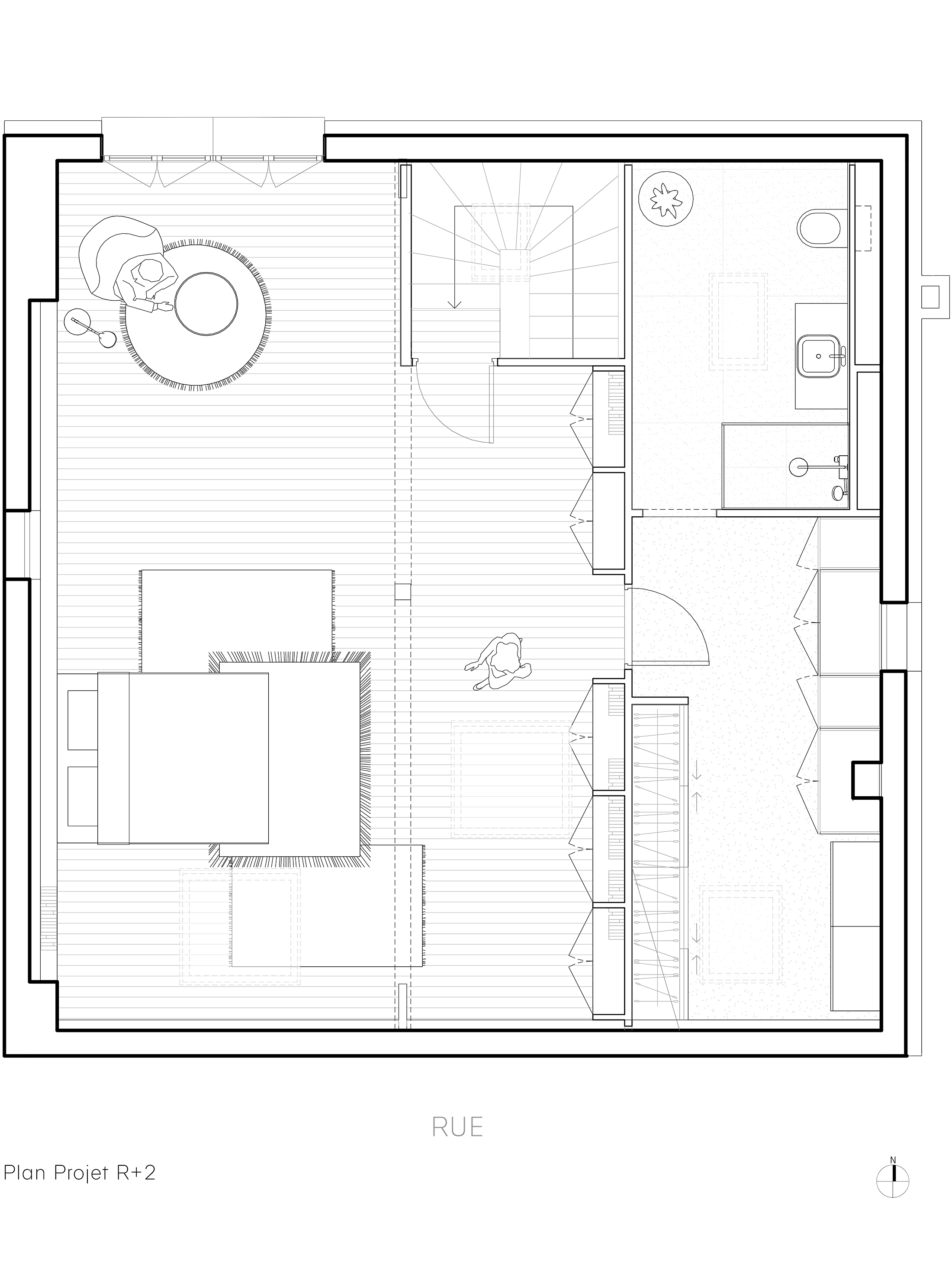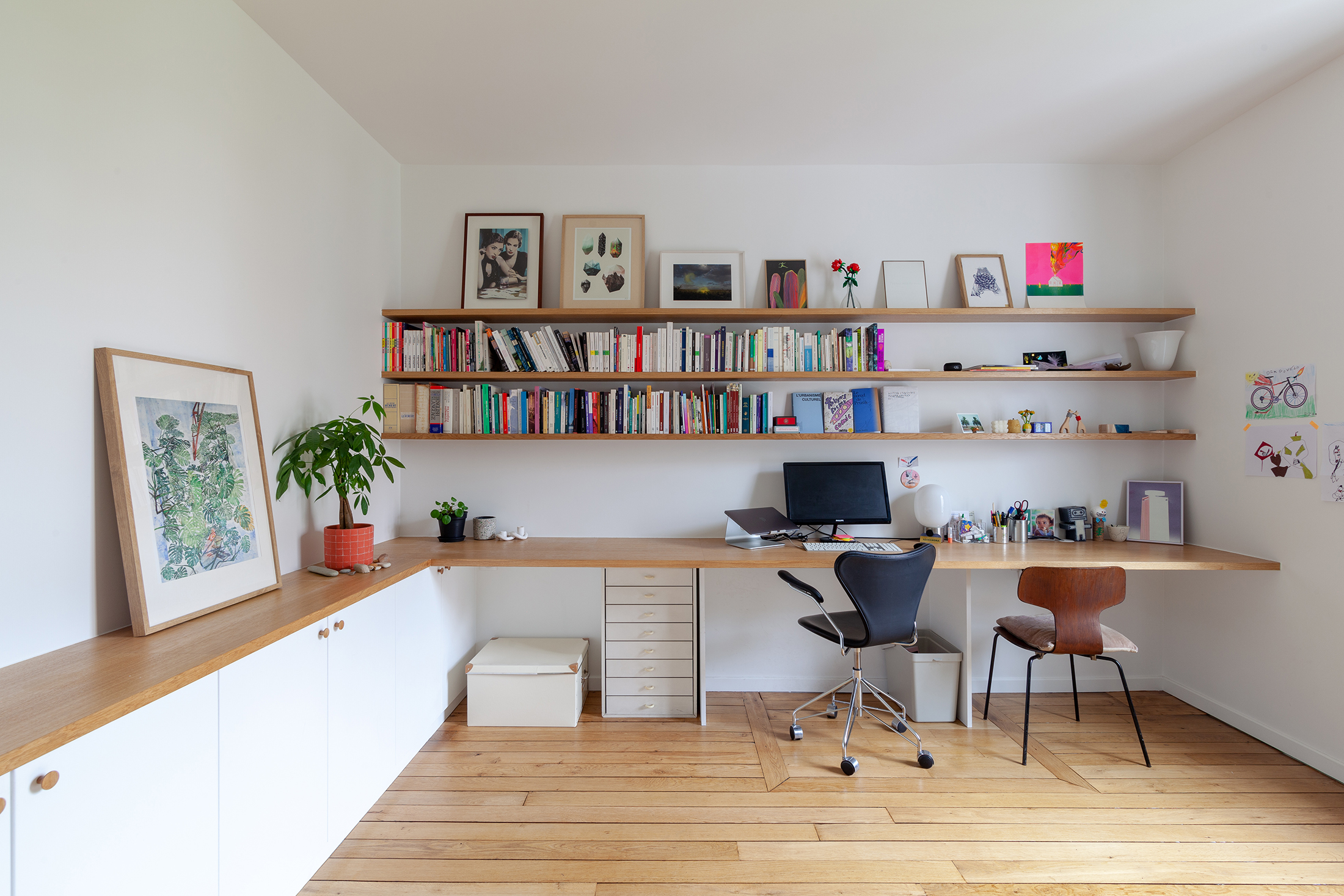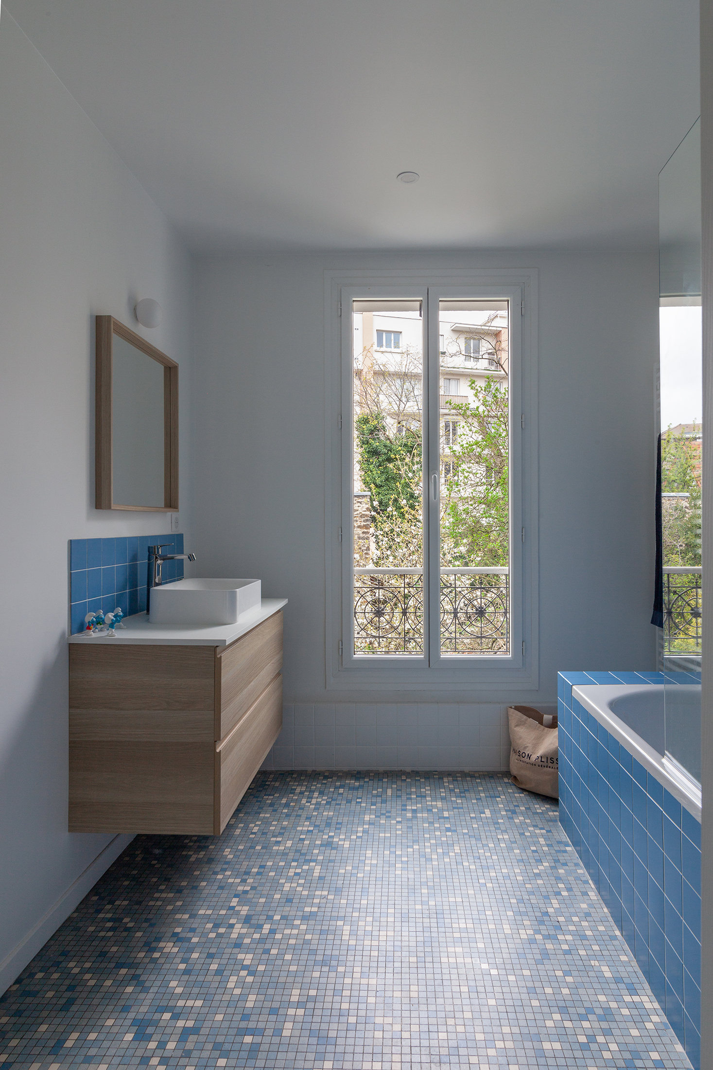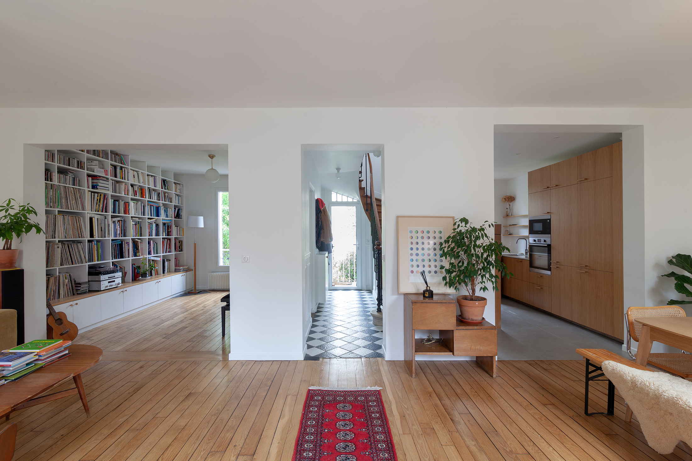 Un travail structurel lourd a été réalisé au sous-sol afin de le décaisser et accueillir un studio de musique professionnel. Le rez-de-chaussée invite à la convivialité et la suite parentale, perchée au dernier étage, bénéficie d’un généreux volume sous combles. Espaces de travail et espaces de vie se complètent et offrent à cette famille un cadre propice à la créativité.