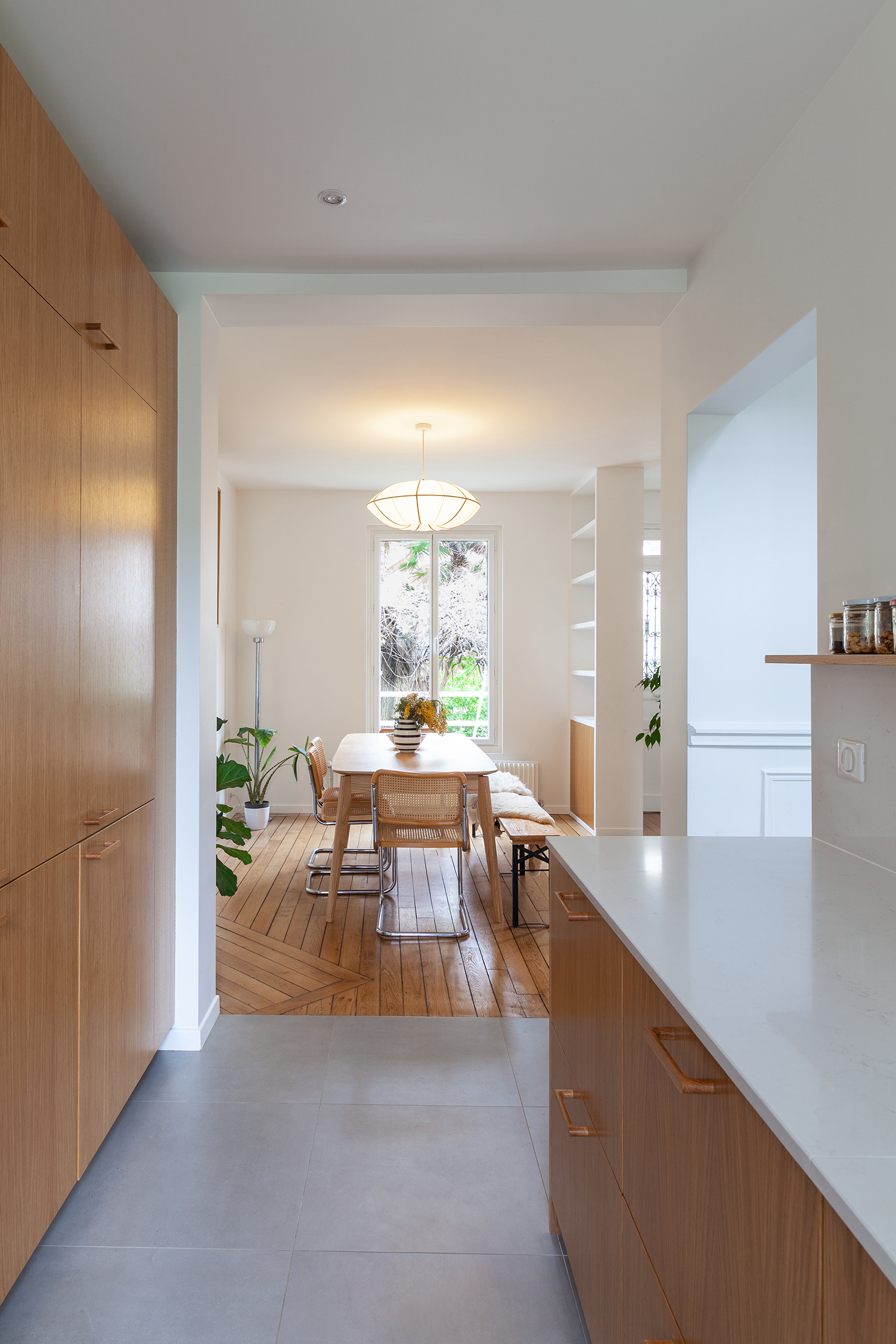 Un confort thermique optimal est atteint grâce à l’isolation des combles et des murs en panneaux de fibre de bois, le remplacement des fenêtres et la restauration de la porte d’entrée. Dans une démarche de durabilité, l’alliance intemporelle du chêne et du blanc sublime le caractère de la maison.