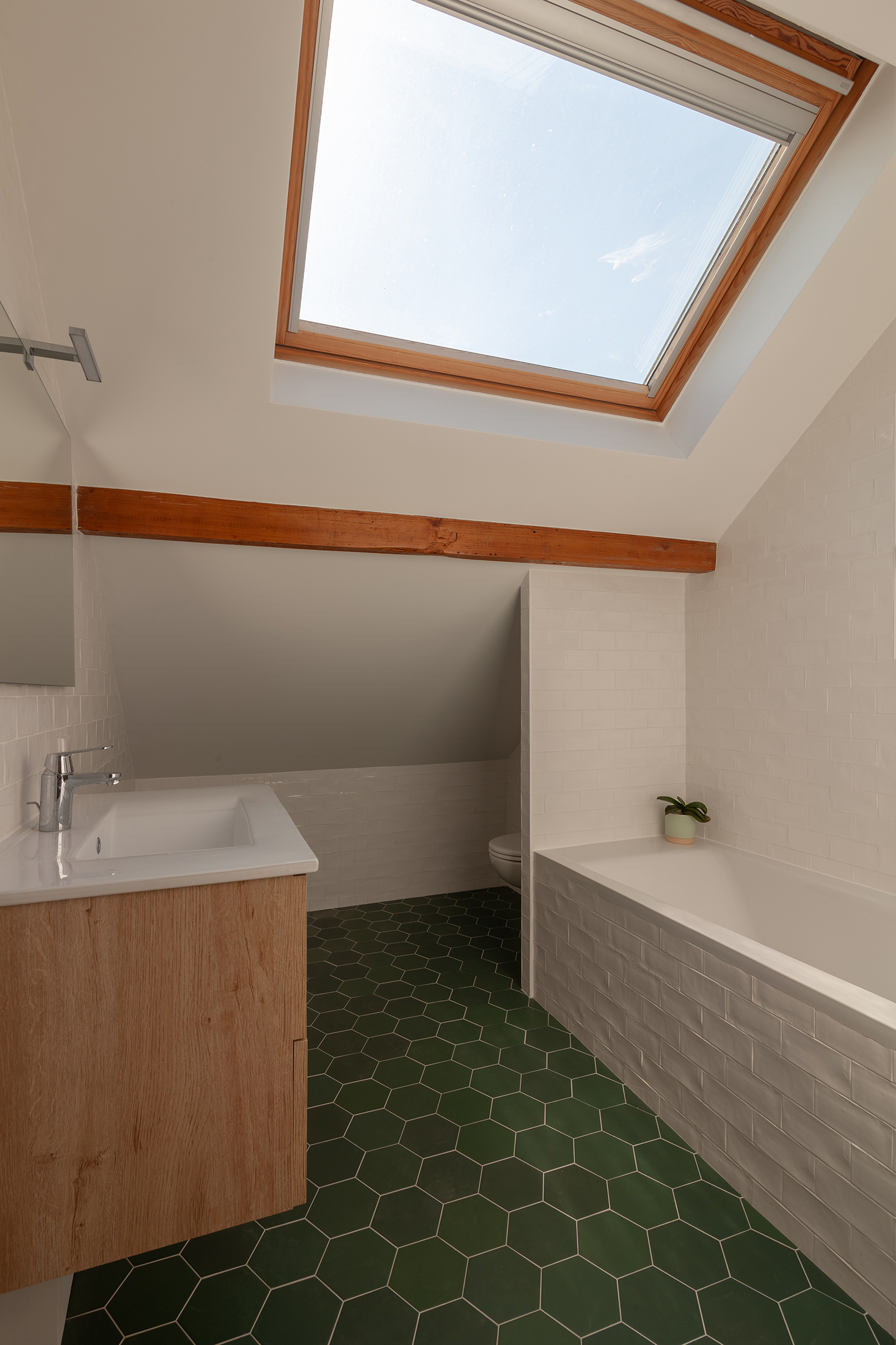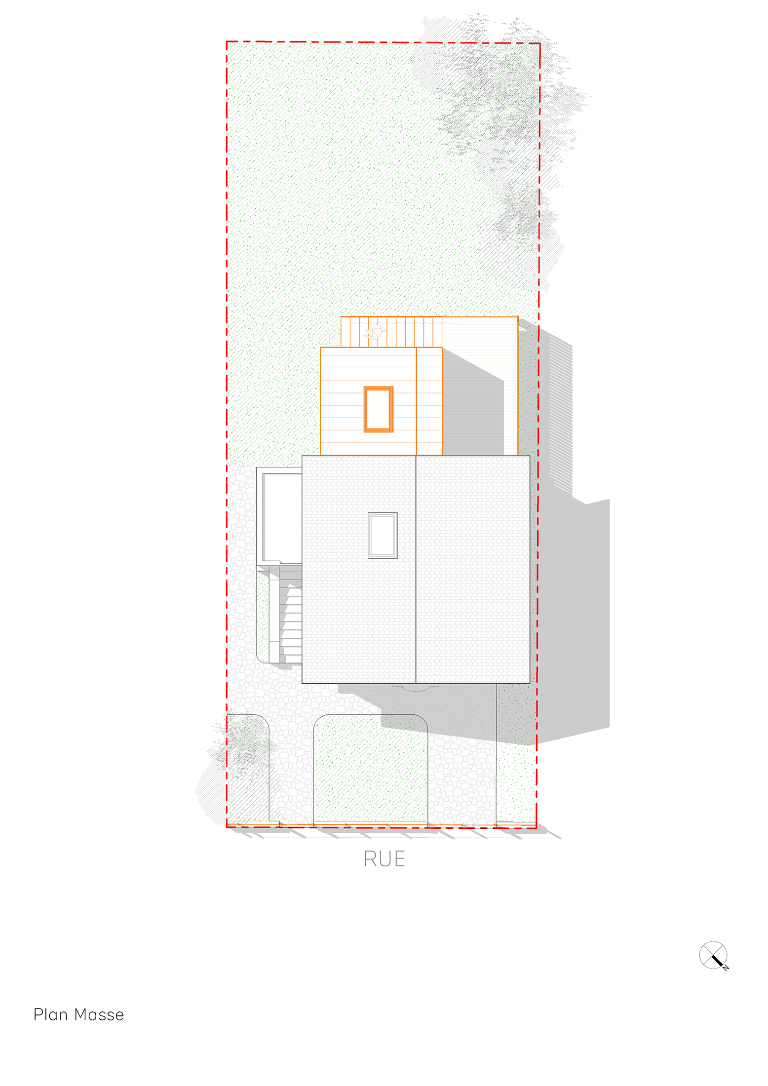Cette extension de 25 m² sur trois niveaux reprend le gabarit de la construction existante, le volume de l’extension vient ainsi se nicher sous la toiture existante afin de s’intégrer au mieux au tissu urbain avoisinant.