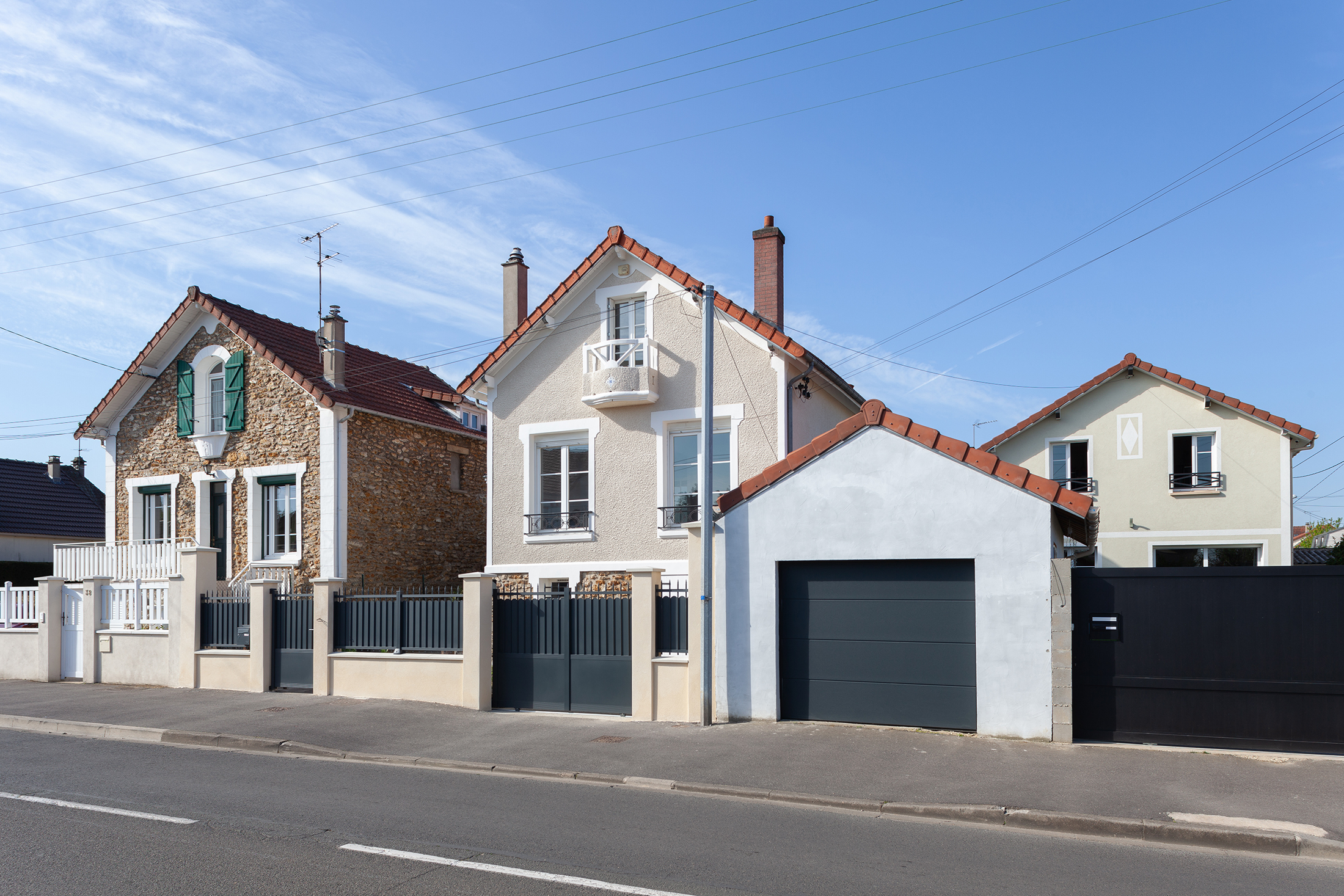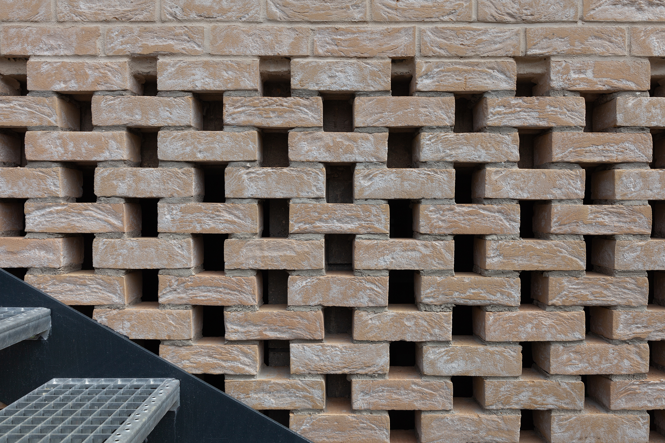 En façade, l’utilisation de la brique moulée main est déclinée, en soubassement l’effet moucharabieh permet d’alléger le volume, en étages la plaquette de parement met en valeur le jeu de percement. L’utilisation de la brique beige-rosé fait écho à la pierre meulière présente en soubassement de la maison existante.